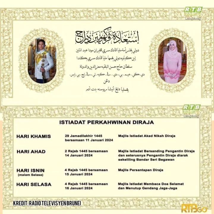 Rangkaian acara pernikahan Pangeran Abdul Mateen dan Anisha Rosnah akan dimulai pada 7 Januari 2024. Berlangsung 10 hari beruntun.