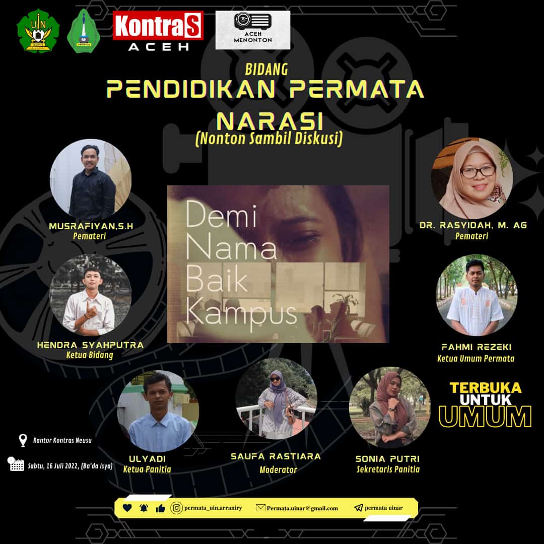 Kegiatan tersebut diberi tema, “Luka Ini Tidak Pernah Hilang” dengan rincian judul besar “Pelecehan seksual: Demi Nama Baik Kampus” yang diselenggarakan Bidang Pendidikan Persatuan Mahasiswa Aceh Tengah-Bener Meriah (PERMATA) UIN Ar-Raniry Banda Aceh berkolaborasi dengan Kontras Aceh dan Aceh Menonton pada Sabtu (16/7/2022) malam.