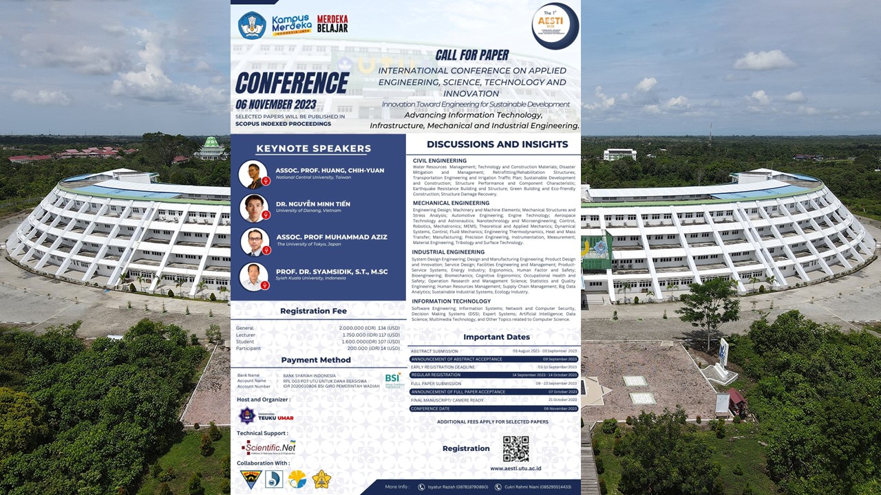 BANDA ACEH, READERS – Fakultas Teknik Universitas Teuku Umar (UTU) Meulaboh, Aceh Barat akan menyelenggarakan seminar internasional yaitu, "International Conferences on Applied Engineering, Science, Technology and Innovation (AESTI, 2023)" secara virtual pada 6 November 2023 mendatang, melalui web resmi AESTI yaitu aesti.utu.ac.id. Rabu (30/8/2023).
