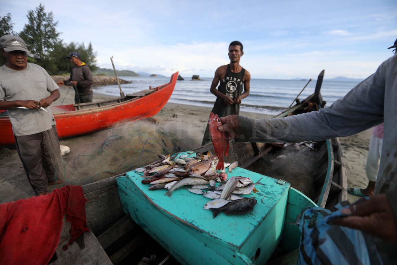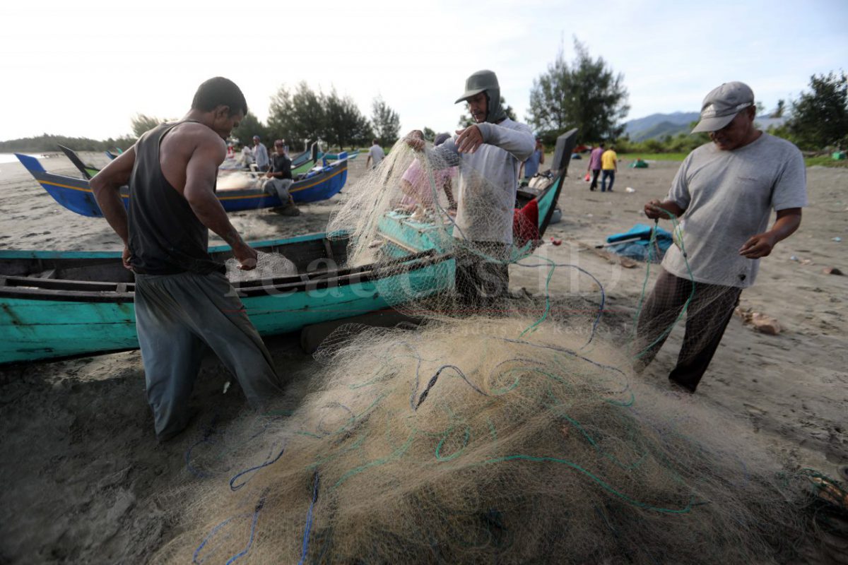 Nelayan tradisional Aceh sedang mengambil ikan dari jaring selepas melaut di kawasan pantai Lam Awe, Peukan Bada, 19 April 2021. Selama bulan Ramadhan, nelayan Aceh tetap melaut untuk memenuhi kebutuhan mereka sehari-hari. Kondisi cuaca yang berubah-ubah menyebabkan hasil tangkapan nelayan di kawasan ini menurun selama bulan Ramadhan. Penurunan tangkapan dan pendapatan nelayan juga turut dipengaruhi daya beli masyarakat yang cenderung menurun di minggu awal bulan Ramadhan.