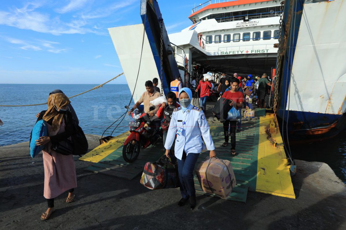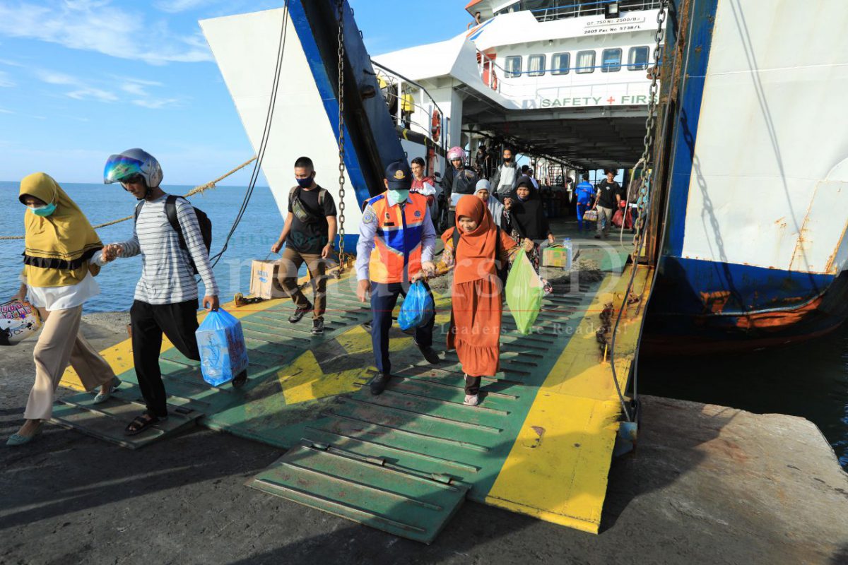 Penumpang KMP Teluk Sinabang sedang turun dari kapal saat bersandar di pelabuhan Kuala Bubon, Meulaboh setelah berlayar dari Sinabang, Simeulu, 23 Mei 2021. Arus balik mudik antar pulau mencapai puncaknya dengan membludaknya jumlah penumpang dan kendaraan yang menyebrang antar pulau setelah pembatasan mudik dan liburan Idul Fitri berakhir.
