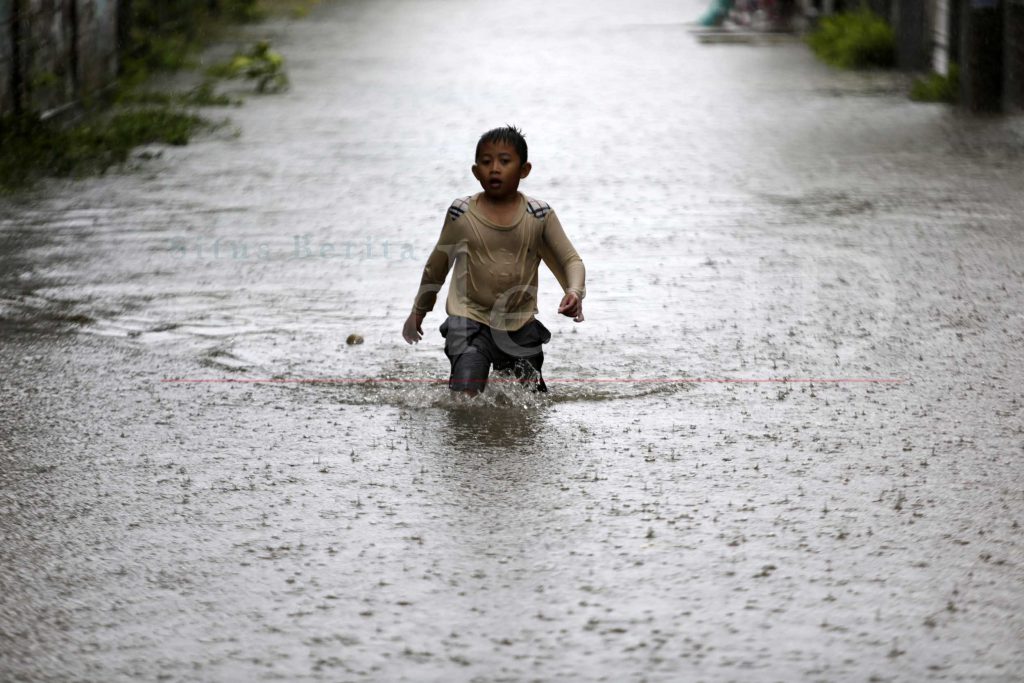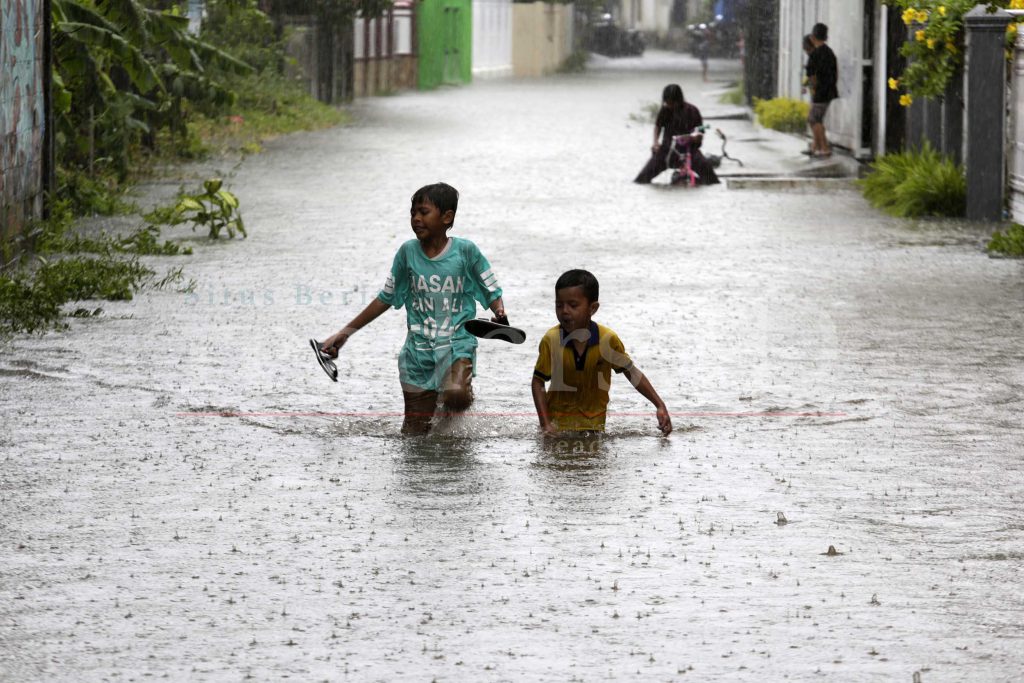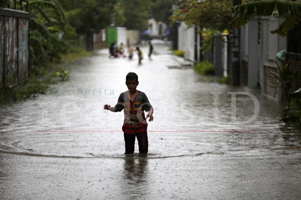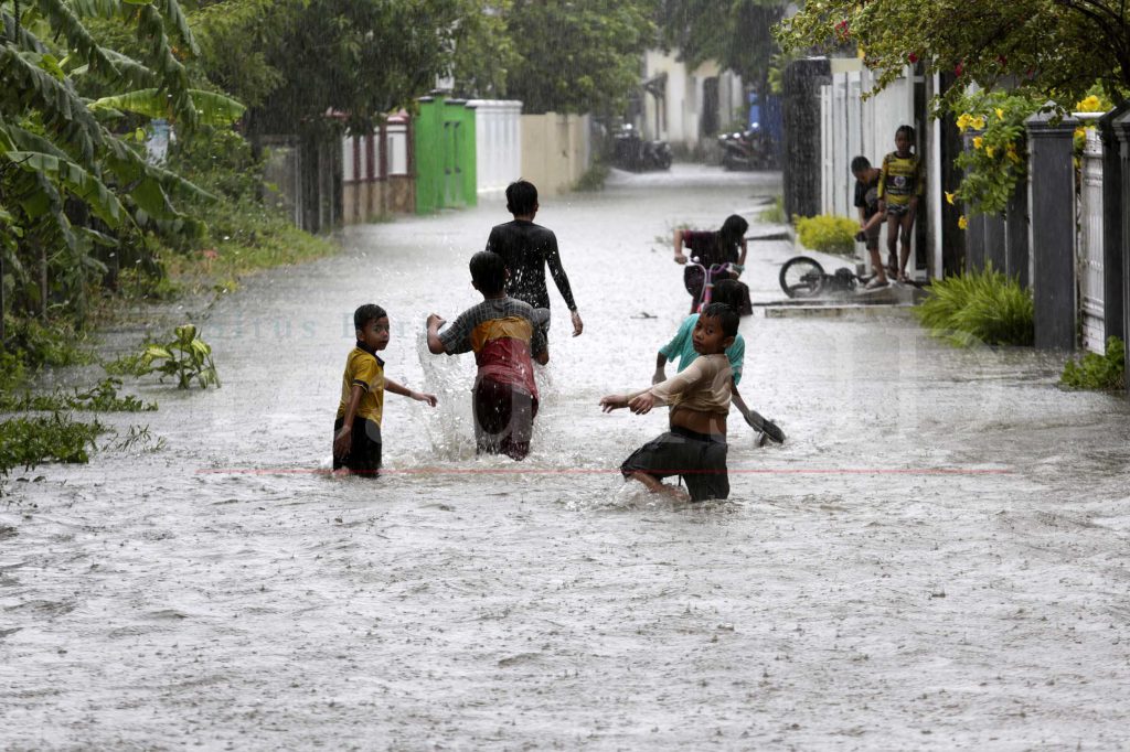 Anak-anak sedang bermain di genangan air yang membanjiri kawasan pemukiman di Desa Lambheu, Keutapang Aceh Besar, 09 Juli 2021. BMKG mengeluarkan peringatan dini potensi Hujan Lebat yang dapat disertai kilat/ petir dan angin kencang di wilayah Sabang, Banda Aceh, Aceh Besar, Simeulue, Gayo Lues, Aceh Barat Daya, Bener Meriah, Aceh Tengah, Aceh Selatan, Aceh Tamiang, Langsa, dan sekitarnya.