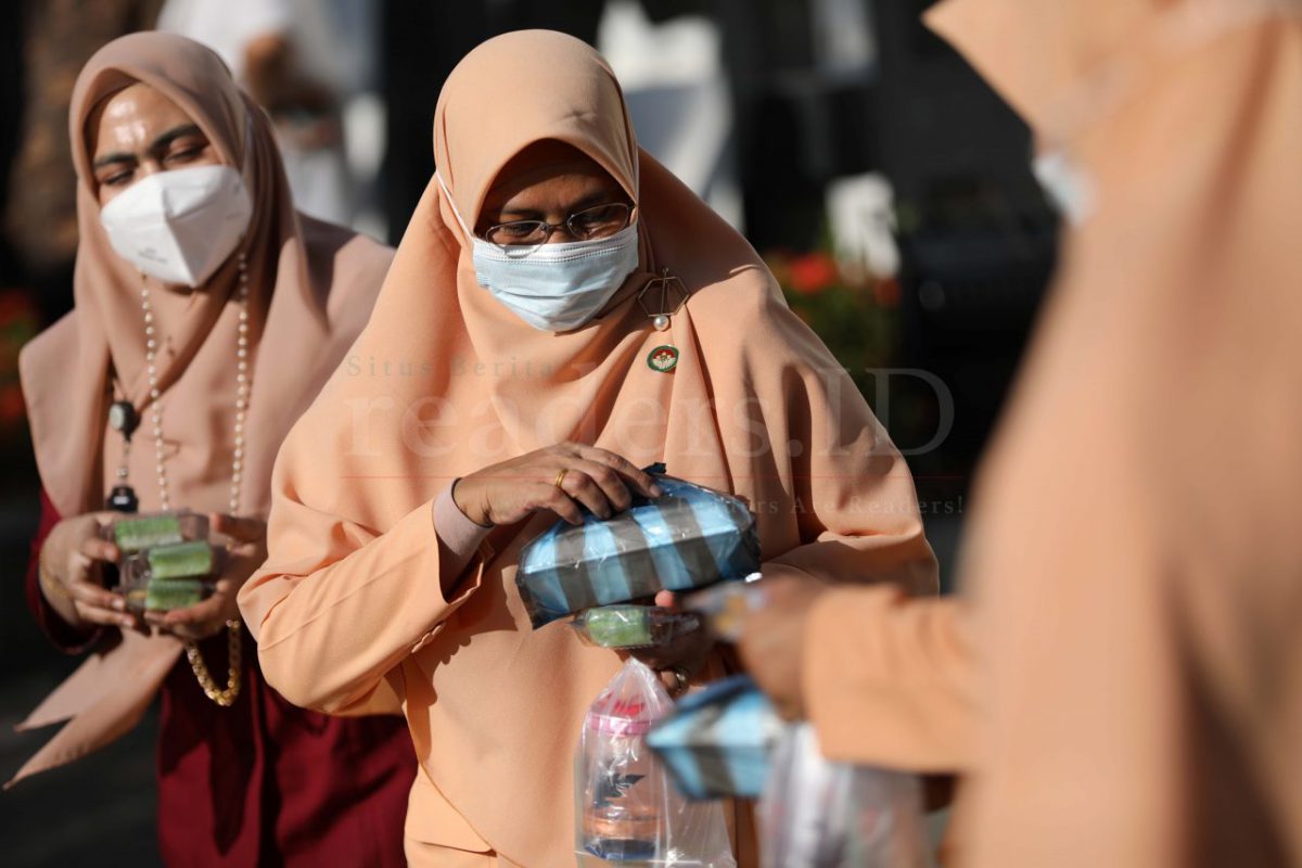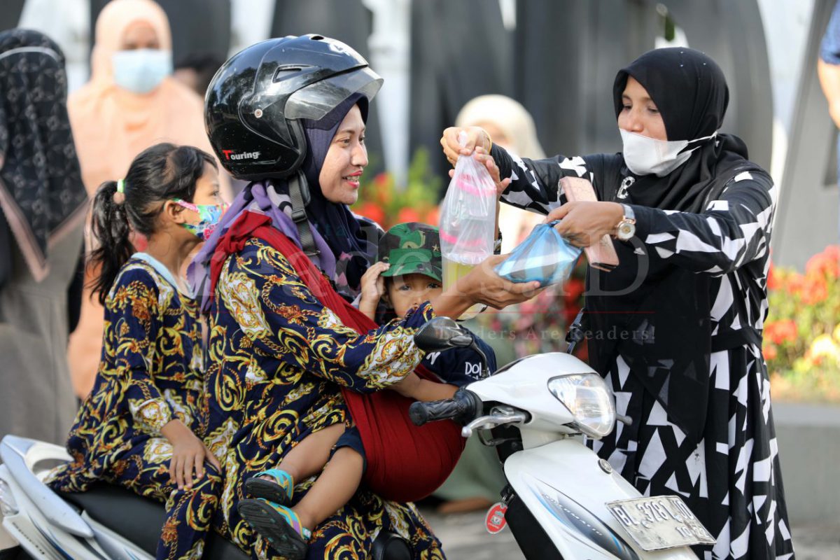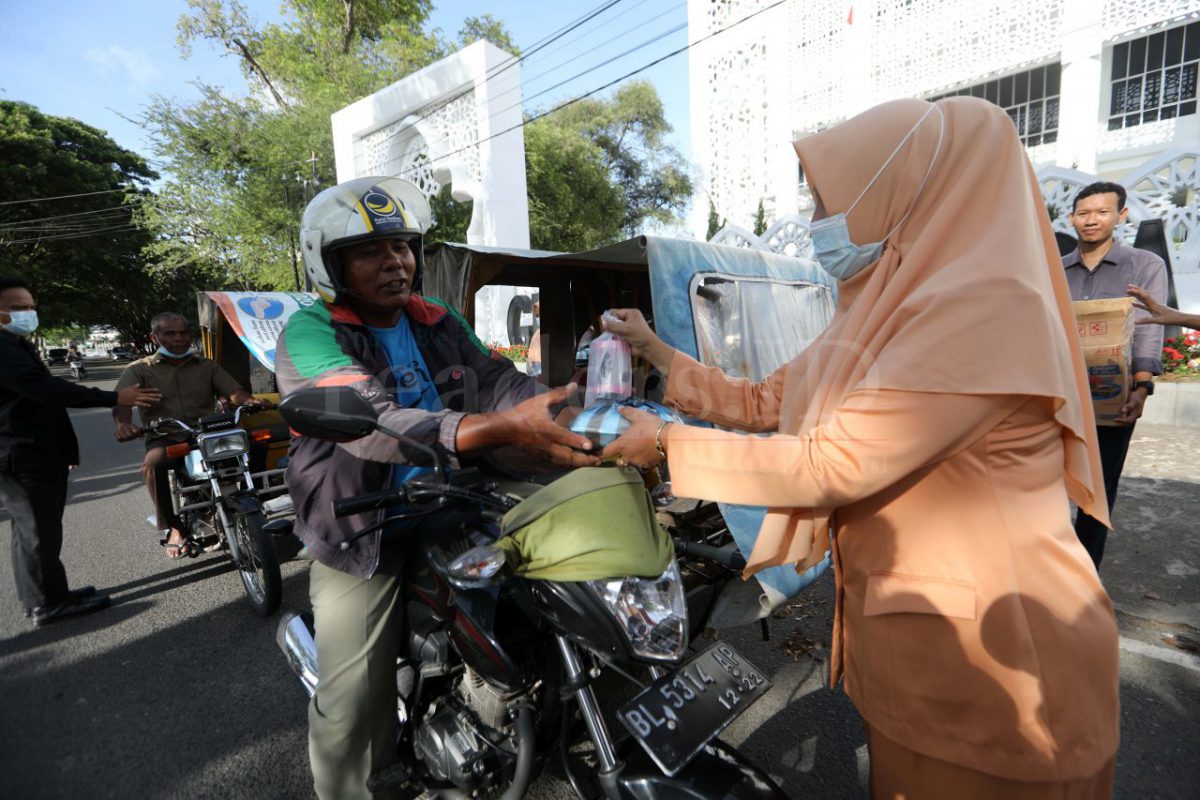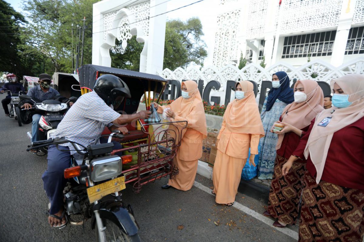 Ibu-Ibu Dharma Wanita Persatuan (DWP) dan Aparatur Sipil Negara (ASN) Sekretariat DPRK Banda Aceh sedang membagikan takjil berbuka puasa bagi pengguna jalan, khusunya para pengemudi becak di depan gedung DPR Kota Banda Aceh, 16 April 2021.