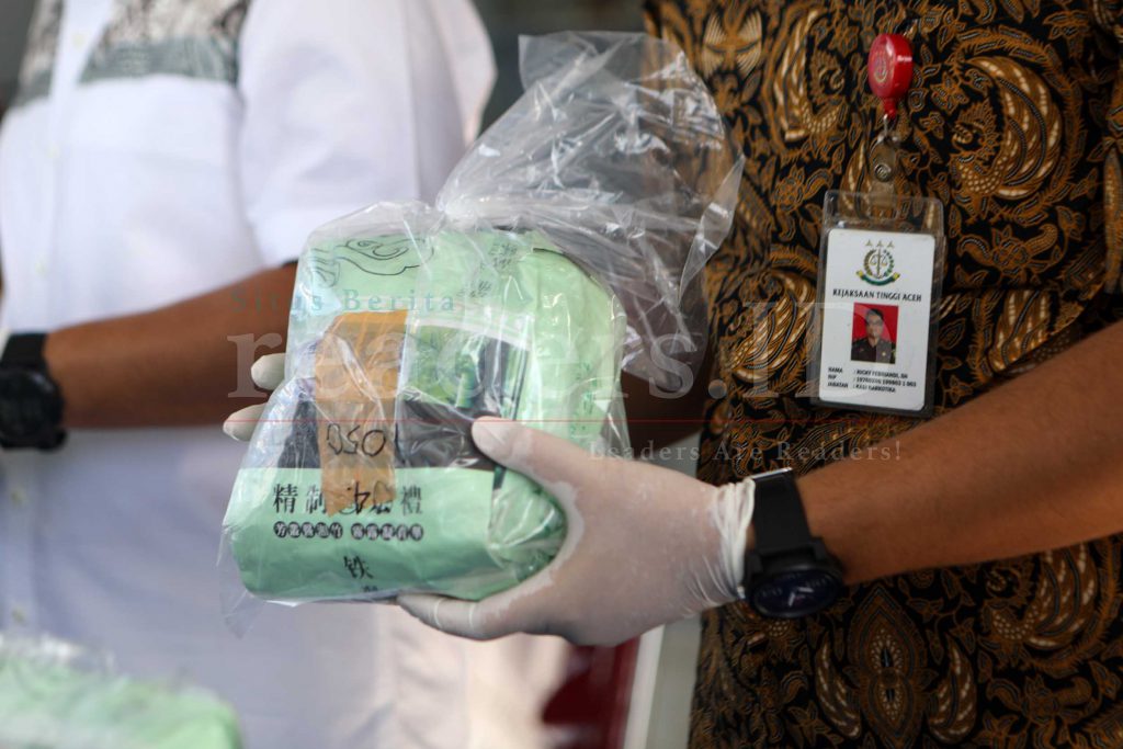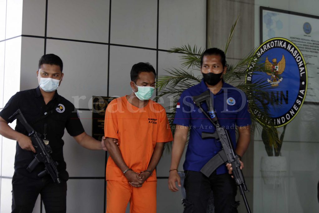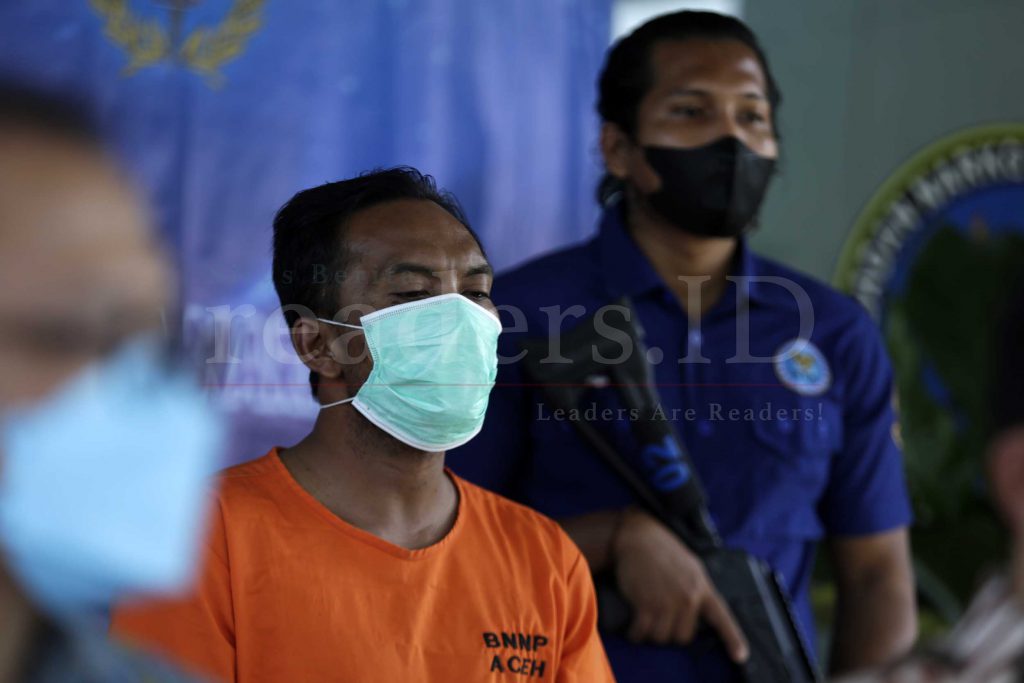 Badan Narkotika Nasional Provinsi (BNNP) Aceh beserta Direktorat Reserser Narkoba (Dit Resnarkoba) Kepolisian Daerah Aceh (Polda) sedang memperlihatkan tersangka dan barang bukti kejahatan narkoba di Kantor BNNP Aceh, Indonesia, 16 Juli 2021. BNN dan Direktorat Reserser Narkoba (Dit Resnarkoba) Kepolisian Daerah Aceh (Polda) berhasil menangkap seorang warga, berinsial M (39) di kawasan Jalan Laksamana Malahayati, Gampong Neuhen, Kecamatan Masjid Raya, Aceh Besar karena menyeludupkan 31,4 kilogram narkotika jenis sabu-sabu dari Malaysia ke Aceh, Indonesia.