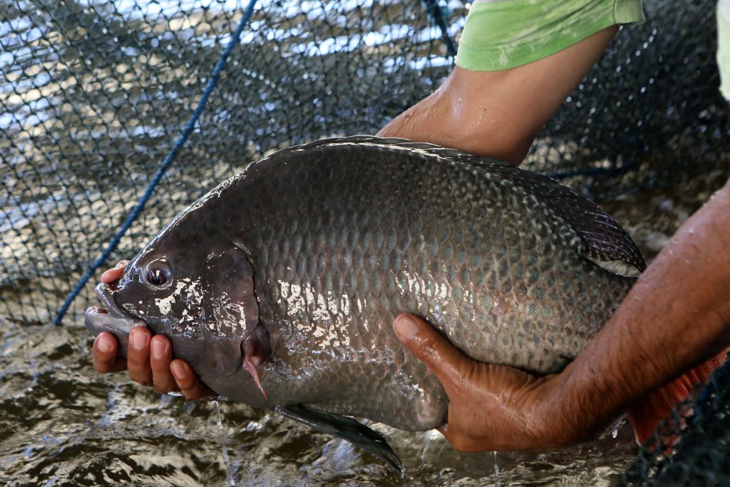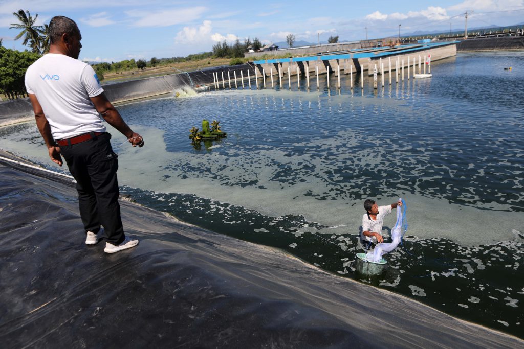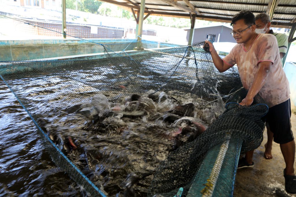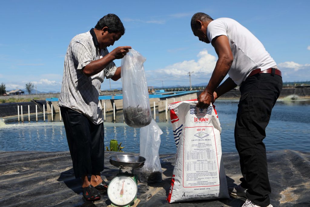 Petugas Balai Perikanan Budidaya Air Payau (BPBAP) Kementerian Kelautan dan Perikanan memanen udang serta memberi pakan untuk bibit ikan nila yang dikembangkan di Ujong Batee, Aceh Besar, Aceh, Indonesia 28 Juli 2021. BPBAP Ujong Batee hingga saat ini mampu memproduksi 1,5 juta lebih bibit nila untuk membantu memenuhi permintaan pembudidaya ikan air payau di 23 kabupaten/Kota di Provinsi Aceh.