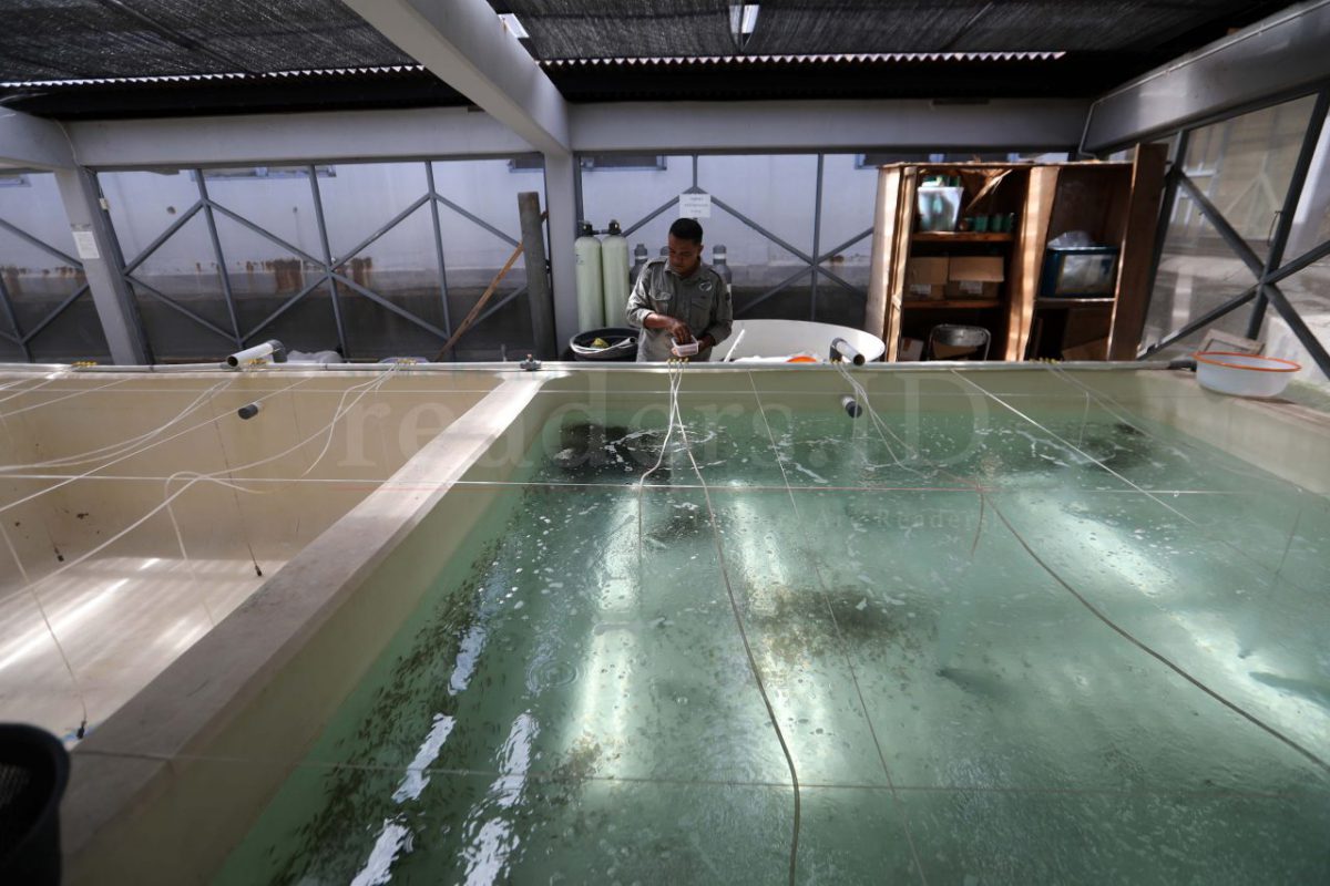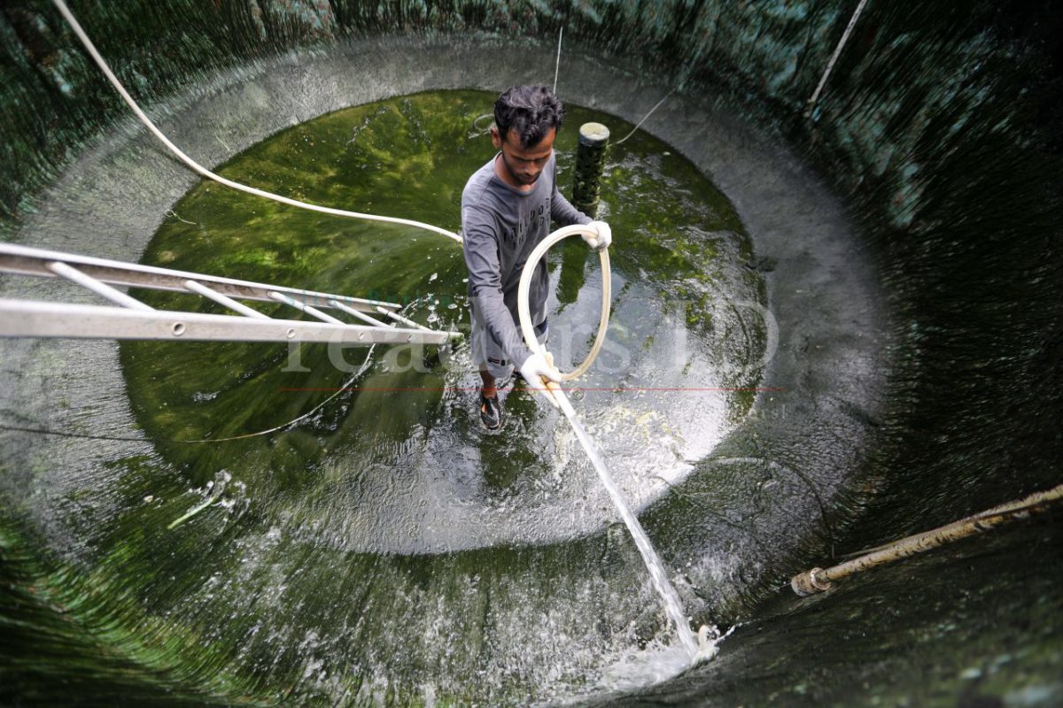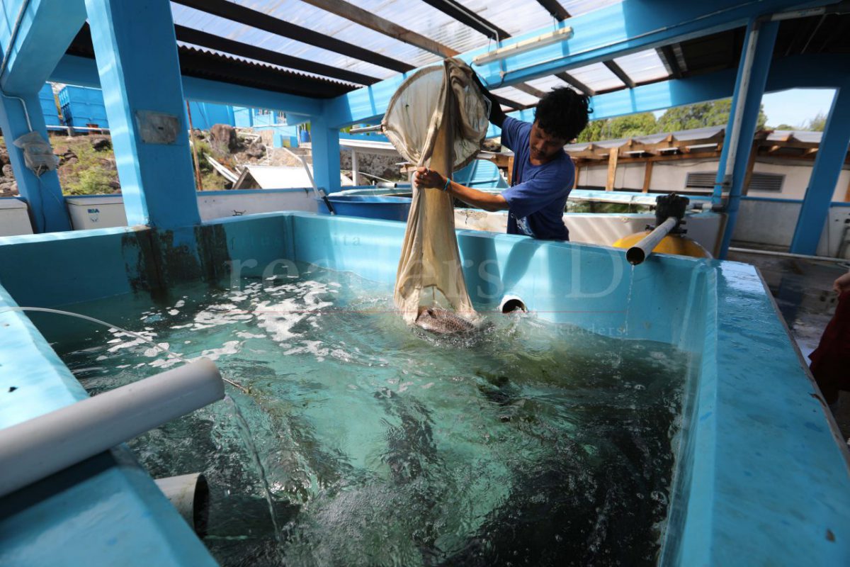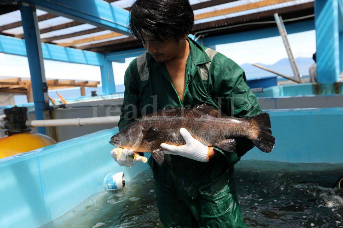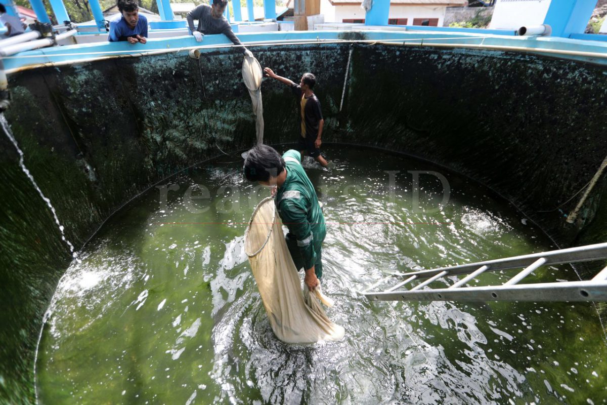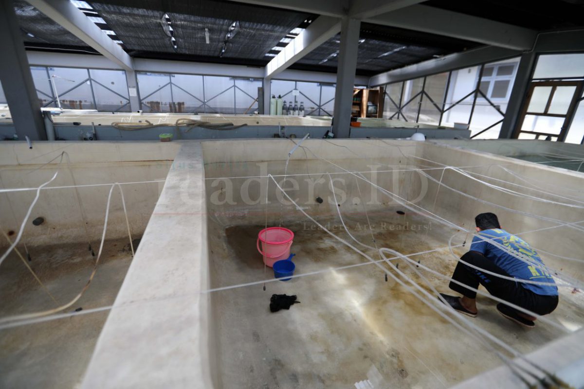 Pekerja sedang membersihkan kolam indukan ikan air payau yang ada di balai Perikanan Budidaya Air Payau Ujung Batee (BPBAP-UB), Aceh Besar, Indonesia, 30 Maret 2021.