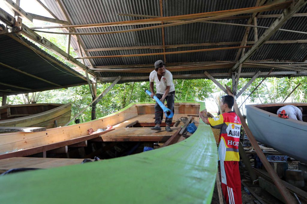 Pekerja sedang menyelesaikan pembuatan kapal kayu di galangan kapal tradisional di kawasan Lamteh, Peukan Bada, Aceh Besar, 01 November 2021. Nelayan Aceh hingga saat ini masih tergantung dengan industri pembuatan kapal tradisional dengan bahan material kayu.