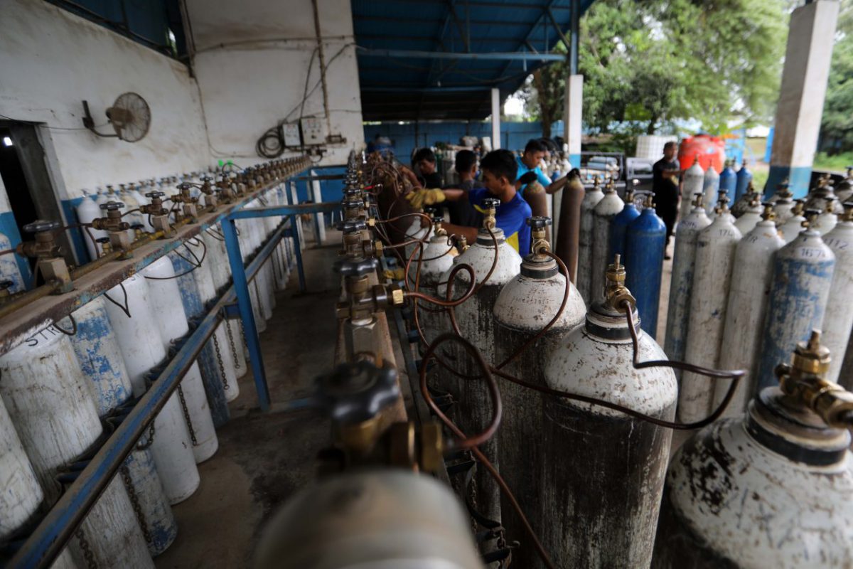 Petugas stasiun pengisian ulang oksigen sedang melakukan pengisian tabung oksigen untuk kebutuhan rumah sakit dan industri di kawasan Ule Kareng, Banda Aceh, Indonesia. Kebutuhan oksigen cenderung meningkat seiring dengan meningkatnya jumlah kasus covid-19 di Aceh.