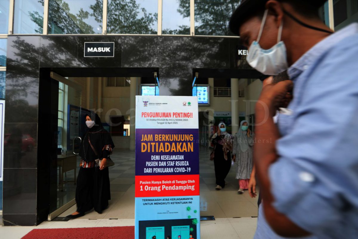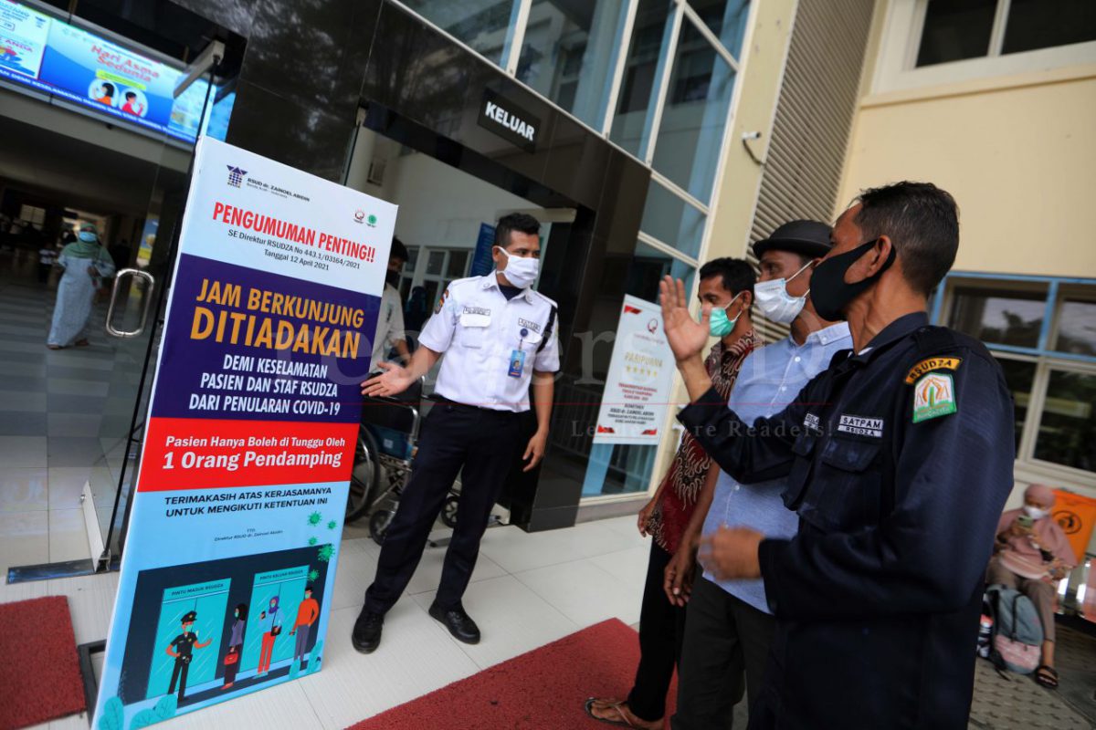 Petugas keamanan Rumah Sakit Umum Zainal Abidin sedang melakukan sosialisasi soal ditiadakannya jam berkunjung bagi keluarga pasien di RSU Zainal Abidin, Banda Aceh, Indonesia, 21 Mei 2021. Peraturan soal ditiadakannya jam berkunjung merupakan salah satu cara untuk menghindari penyebaran COVID-19 yang akhir-akhir ini kasusnya meningkat di Aceh.