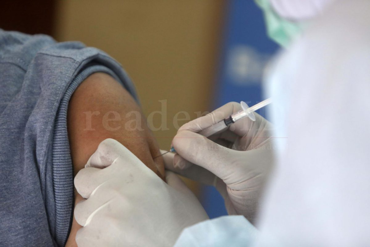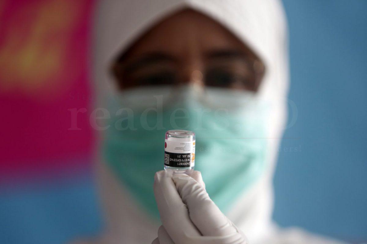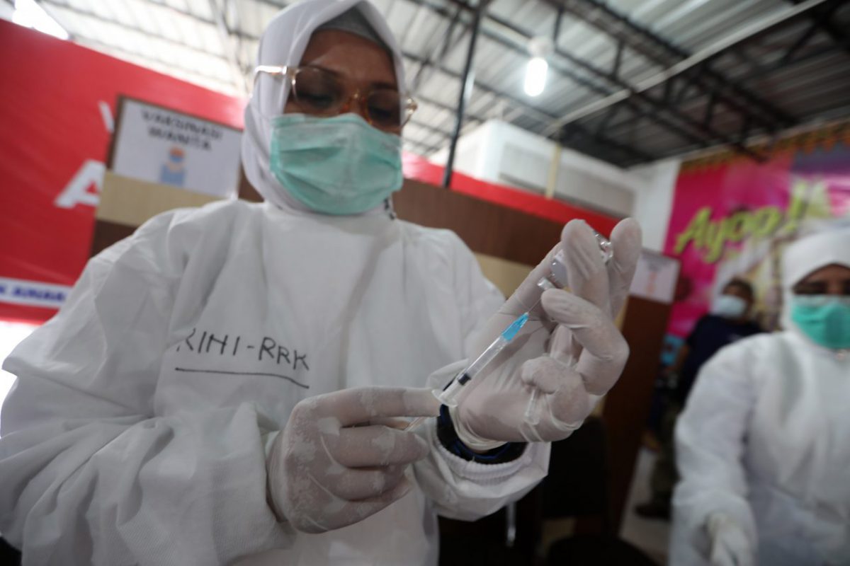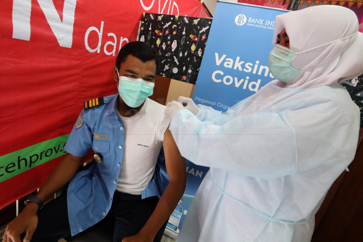Petugas kesehatan sedang melakukan vaksinasi bagi staff Angkasa Pura II Aceh, di Rumah Sakit Ibu dan Anak, Banda Aceh, Indonesia, 22 Maret 2021. Pemerintah Indonesia mempercepat proses vaksinasi bagi masyarakat karena sebagian vaksin yang sudah berada di Indonesia sudah mendekati masa kadaluarsa.