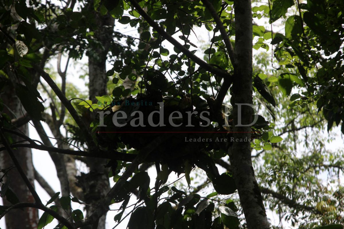 Orangutan sedang memanjat pohon untuk mengambil buah-buahan di atas pohon di kawasan stasiun penelitian Ketambe, Taman Nasional Gunung Lauser April 2021. Stasiun Penelitian Ketambe di kawasan Taman Nasional Gunung Leuser, Aceh Tenggara, merupakan salah satu tempat habitatnya orangutan (Pongo abelii) di Indonesia.