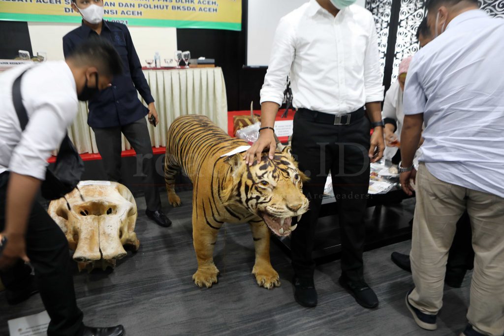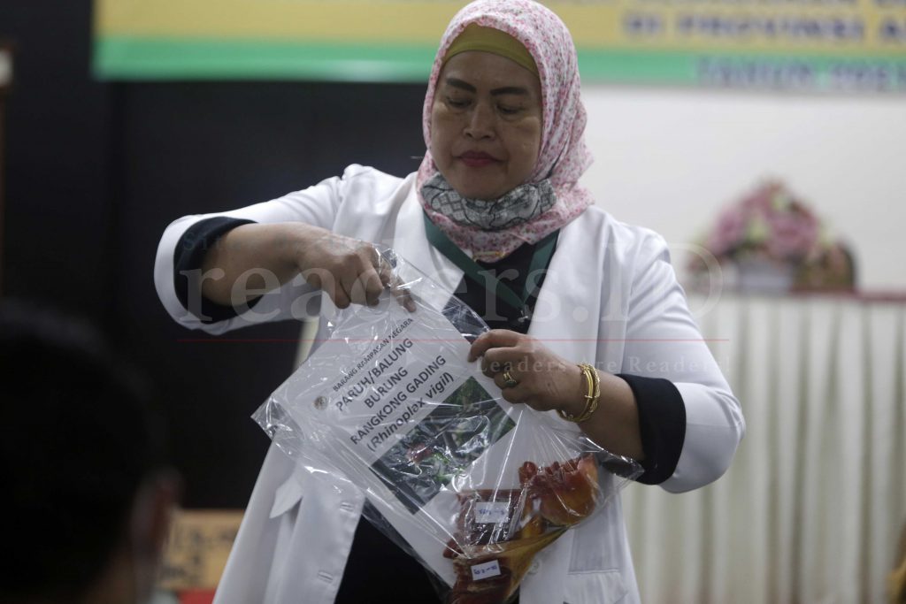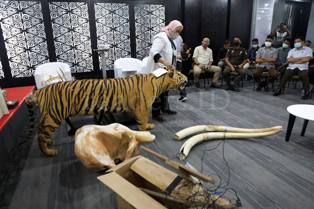 Taing Lubis, dokter hewan dari BKSDA sedang memberi penjelasan cara mengidentifikasi bagian-bagian tubuh satwa yang dilindungi untuk keperluan penyelidikan kejahatan satwa liar, saat pelatihan forensic terbatas bagi personil penegak hukum di Banda Aceh, Indonesia, 30 Juni 2021. Polda Aceh bekerjasama Lembaga Suar Galang Keadilan (LSGK) mengadakan pelatihan sebagai upaya untuk meningkatan kemampuan personil Polda Aceh dalam rangka upaya pencegahan dan penegakan hukum konservasi sumber daya alam dan lingkungan hidup di wilayah Aceh.