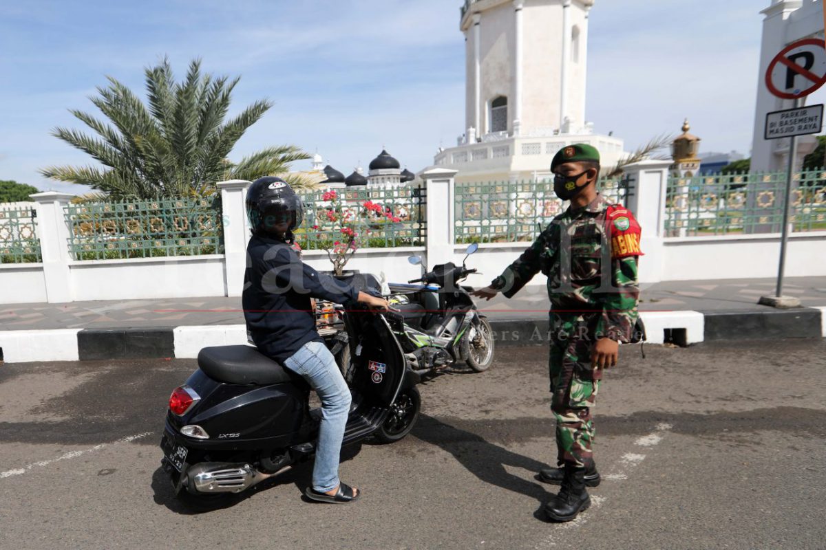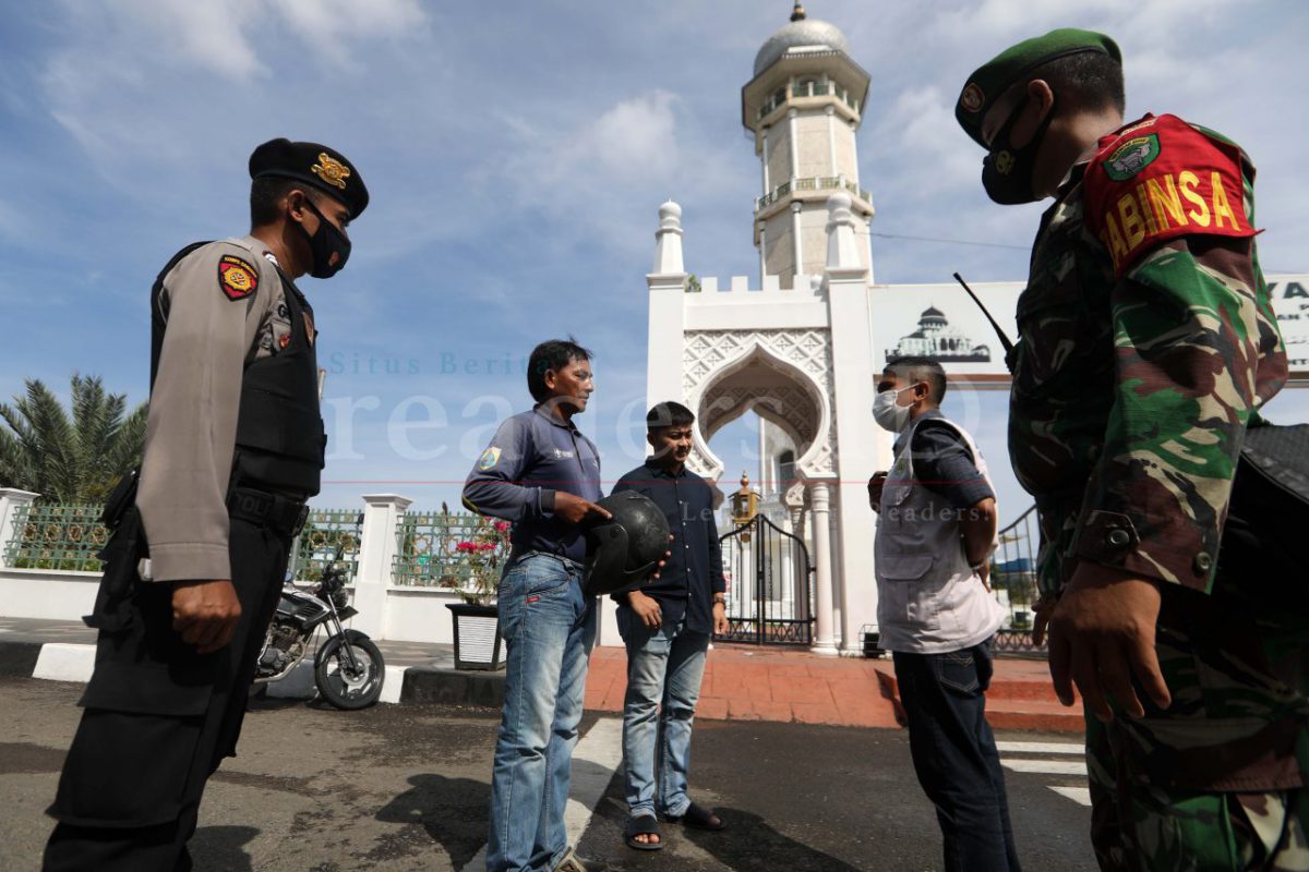 Petugas gabungan sedang melakukan razia protokol kesehatan di kawasan Mesjid Raya Baiturrahman, Banda Aceh, 30 April 2021. Indonesia mengalami peningkatan kasus COVID-19 di beberapa wilayah seperti Sumatera Selatan, Aceh, Lampung, Jambi, Kalimantan Barat, NTT, Riau, Bengkulu, dan Kepulauan Riau. Peningkatan ini erat kaitannya dengan semakin kurangnya kepatuhan masyarakat dalam menjalankan protokol kesehatan