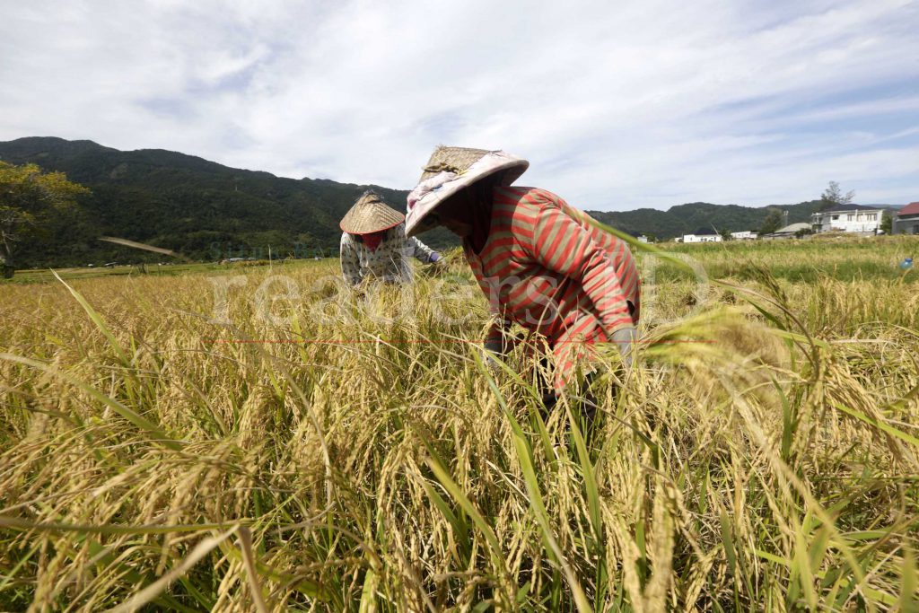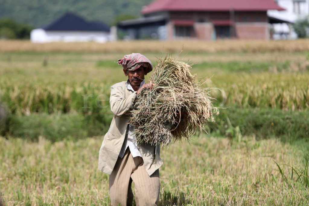 Petani sedang memanen padi di kawasan Lampeunurut, Aceh Besar, Indonesia, 11 Oktober 2021. Luas panen padi dan produksi padi di provinsi Aceh pada tahun 2020 sebesar 317,87 ribu hektar, mengalami kenaikan sebanyak 7,86 ribu hektar atau 2,53 persen dibandingkan 2019 yang sebesar 310,01 ribu hektar, dengan produksi padi pada 2020 sebesar 1,76 juta ton gabah kering giling (GKG), mengalami kenaikan sebanyak 42,88 ribu ton atau 2,50 persen dibandingkan 2019 yang sebesar 1,71 juta ton GKG.