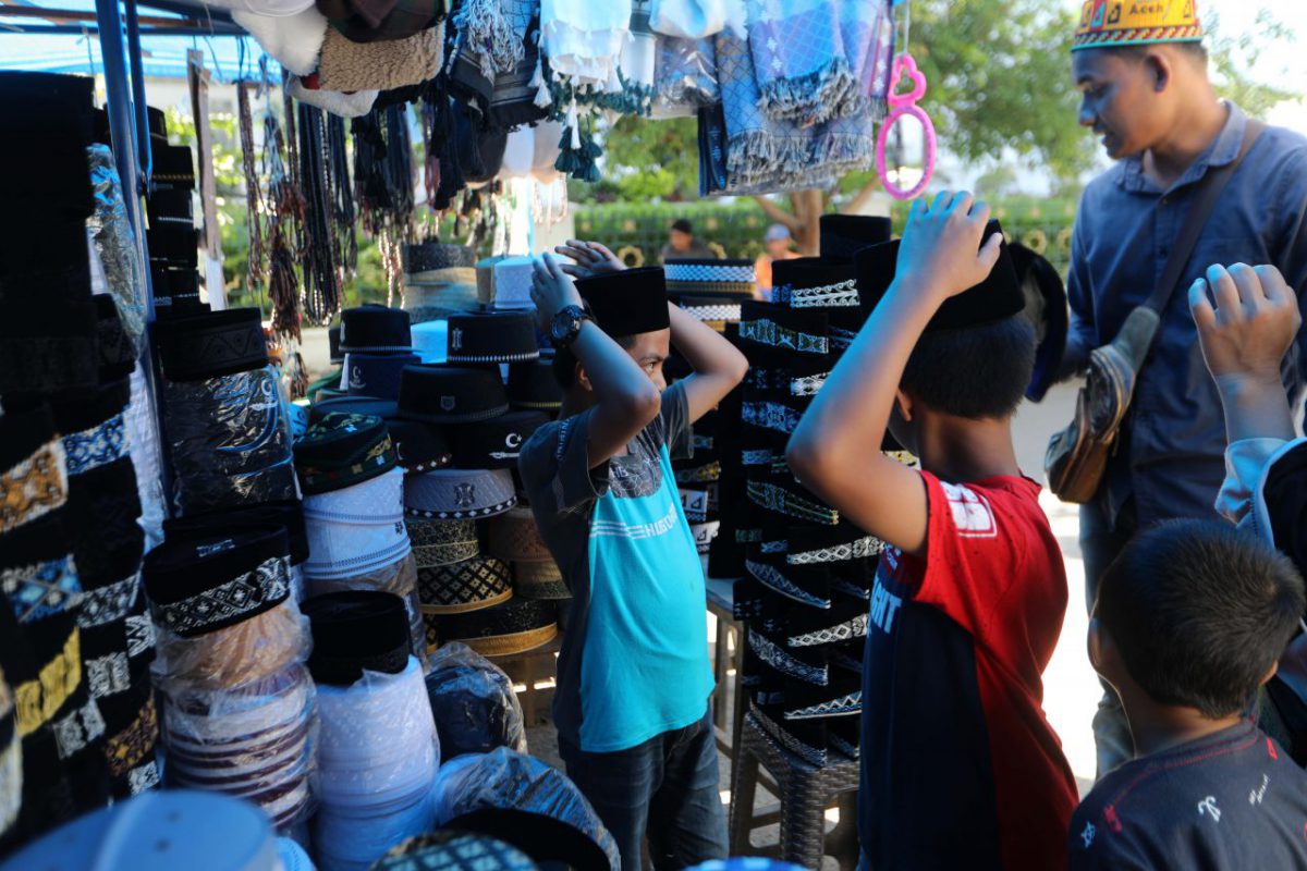 Pedagang kopiah dan aksesoris Ramadan menggelar dagangannya di pasar Aceh, Indonesia, 21 April 2021. Menurut para pedagang di pasar Aceh, sebelum pandemi, mereka mengaku penjualan selama Ramadan bisa mencapai hingga Rp 4 juta per hari karena konsumennya bukan hanya warga lokal Aceh saja, namun juga para wisatawan dalam maupun luar negeri yang sedang berkunjung ke Masjid Raya Baiturrahman.