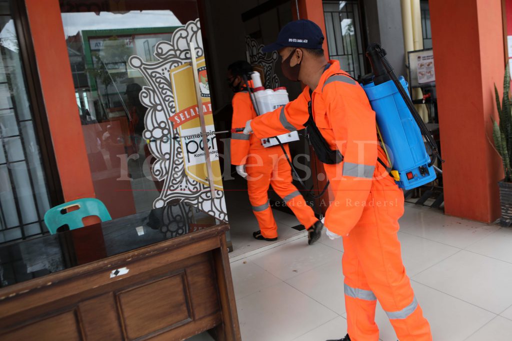 Petugas Badan Penanggulangan Bencana Daerah (BPBD) Kota Banda Aceh melakukan penyemprotan cairan disinfektan di kantor KIP Kota Banda Aceh, 19 Agustus 2021. Menurut Kalaksa BPBD Kota Banda Aceh melalui Koordinator Regu I, Sabri SSos, penyemprotan dilakukan seiring dengan peningkatan penyebaran Virus Corona di Kota Banda Aceh.