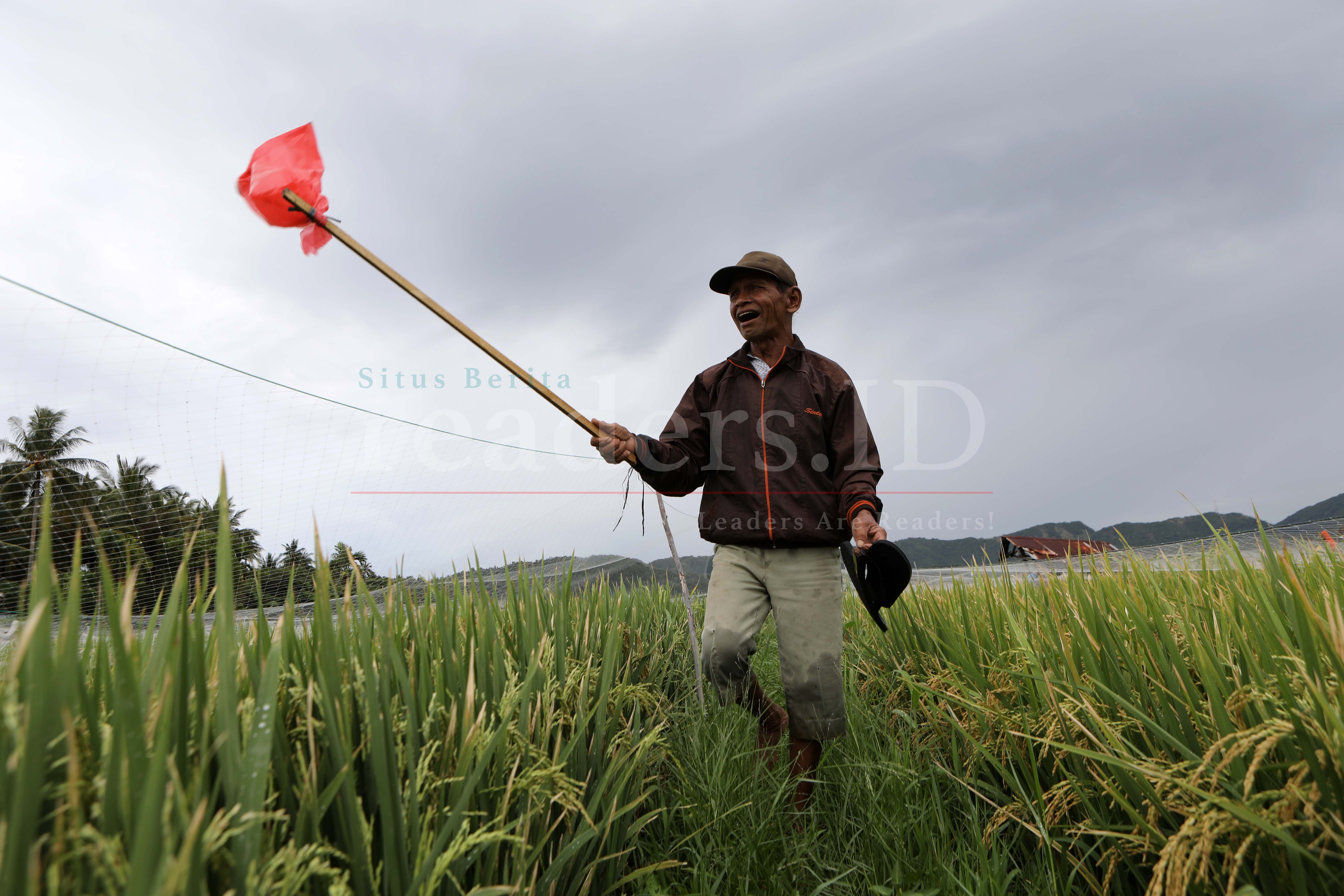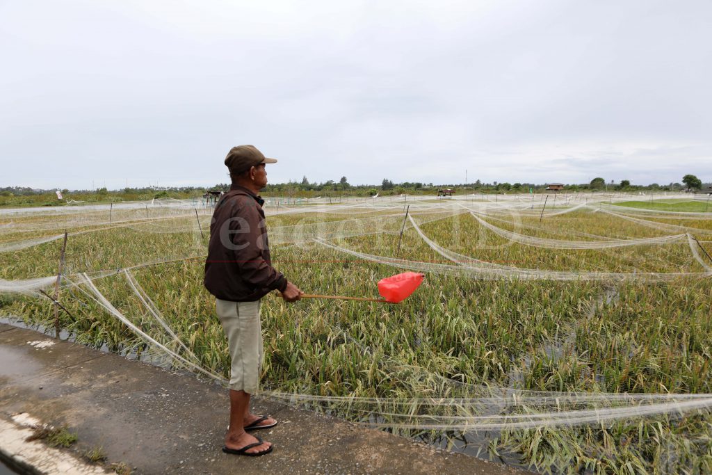 Petani sedang mengusir burung di areal sawah yang tergenang banjir. Foto Hotli Simanjuntak/readers.ID