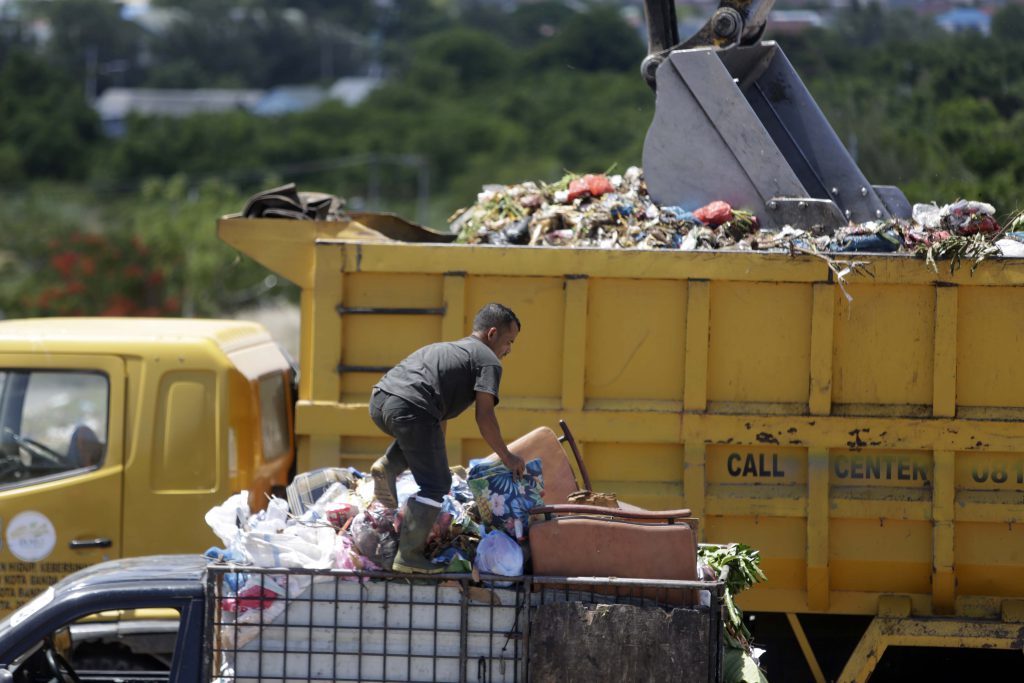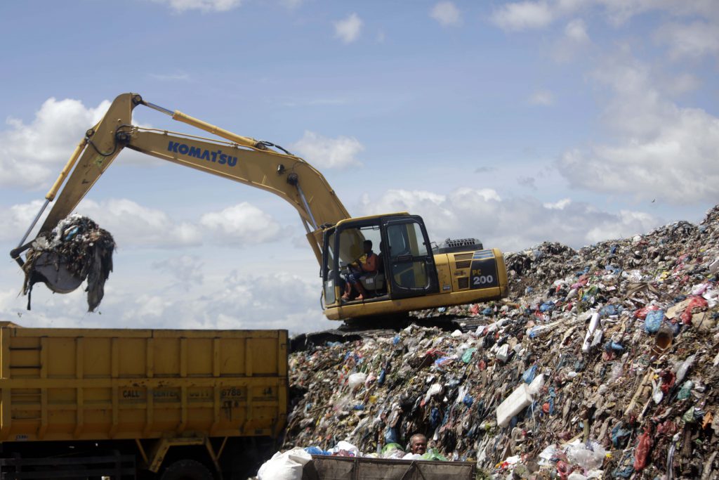 Pekerja sedang menurunkan sampah dari truk pengangkut dengan menggunakan alat berat di Tempat Pembuangan Akhir (TPA) sampah di kawasan Kampung Jawa, Banda Aceh, 22 Juni 2021. Pemerintah Kota Banda Aceh telah mengeluarkan Peraturan Wali (Perwal) Nomor 111 Tahun 2020 tentang kewajiban pembatasan penggunaan kantong plastik di supermarket, swalayan dan mall dalam upaya mengurangi jumlah sampah plastik yang mendominasi TPA