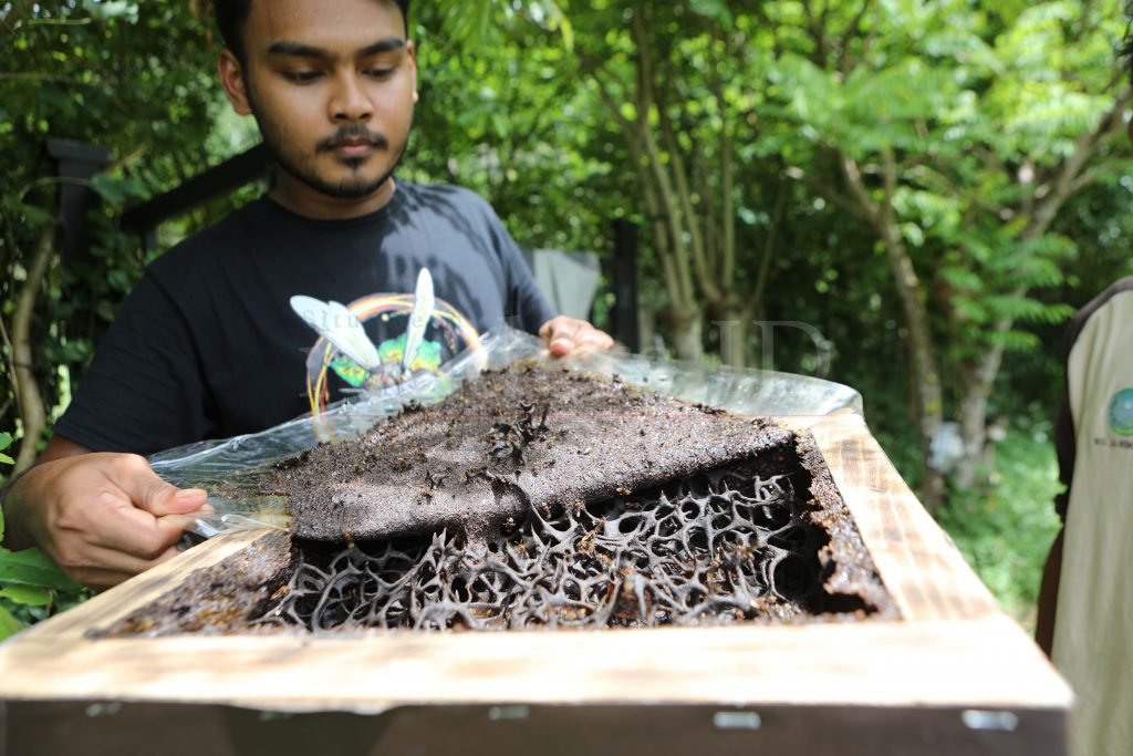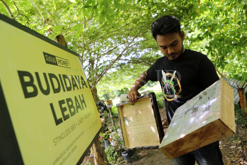 Khairil, peternak madu tanpa sengat (stingless bee) sedang memanen madu dari sarang madu hasil budidaya di Desa Lam Badeuk, Ujong Pancu, Aceh Besar, Indonesia, 23 August 2021. Lebah tanpa sengat (stingless bee), atau lebah kelulut, dalam bahasa Aceh dikenal dengan lebah linot merupakan lebah yang memiliki ukuran tubuh yang lebih kecil dari lebah umumnya. Lebah ini tidak ganas dan berfungsi sebagai penyerbuk bunga-bunga kecil. Lebah ini juga di kenal memiliki kemampuan adaptasi dan daya tahan tertinggi dibanding spesies lebah lainnya.