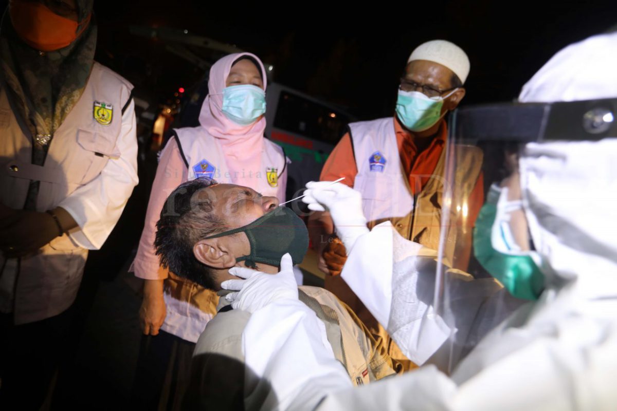 Petugas kesehatan sedang melakukan tes rapid antigen bagi pemudik yang hendak mudik di stasiun bus, Batoh, Banda Aceh, Indonesia 03 Mei 2021. Tes antigen gratis secara random akan dilakukan di setiap terminal di Aceh sesuai tujuan penumpang. Hal ini dilakukan untuk mencegah penyebaran covid-19 dari wilayah yang rawan ke daerah lainya antar kabupaten di Aceh saat terjadinya lonjakan pemudik sebelum larangan mudik tanggal 6-17 Mei mendatang.
