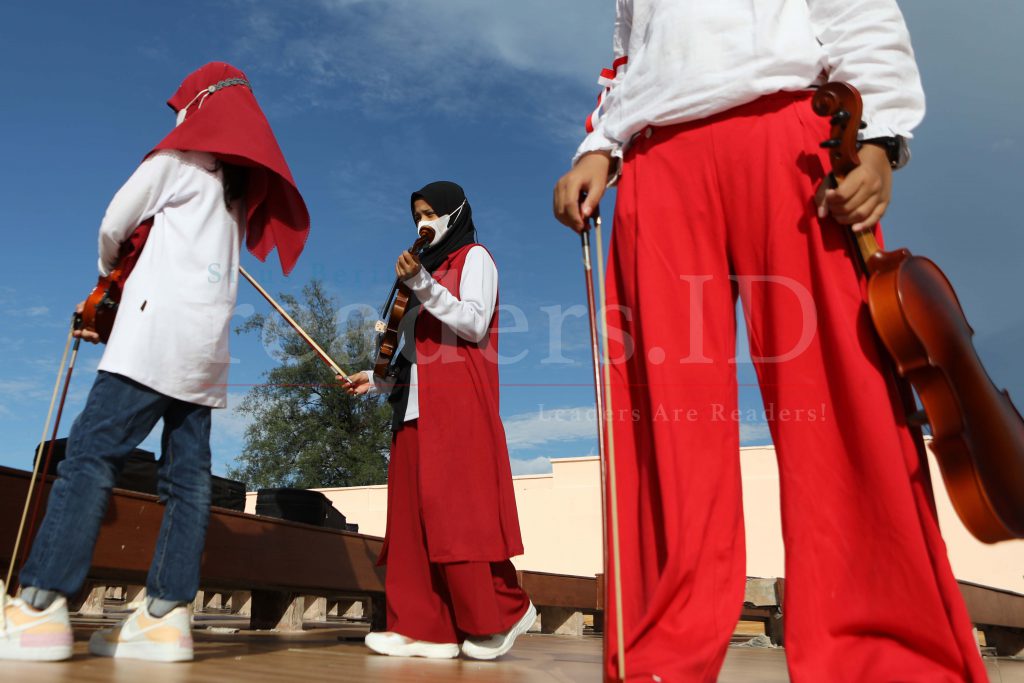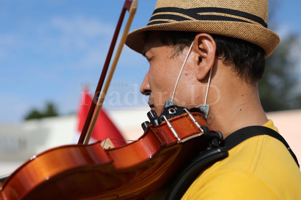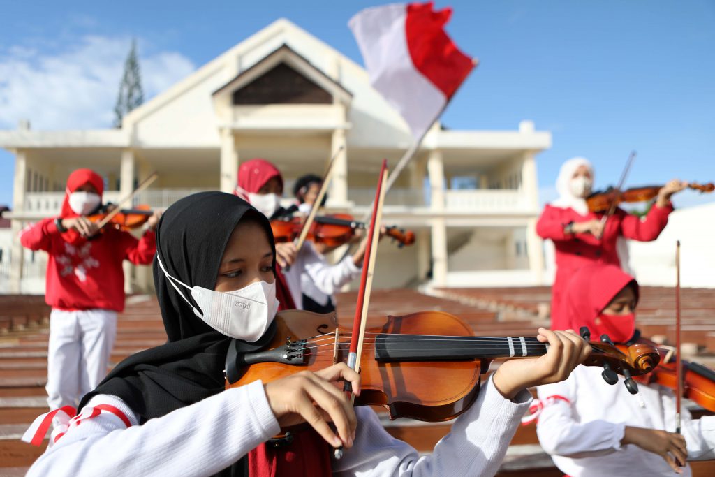 Sejumlah seniman dan musisi cilik yang tergabung dalam Biola Aceh Community sedang bermain musik dalam rangka memperingati HUT RI ke 76 di Taman Budaya, Banda Aceh, Indonesia, 17 Agustus 2021. Perayaan HUT RI kali ini diperingati dengan berbagai cara oleh masyarakat seniman di saat adanya pembatasan aktifitas masyarakat, termasuk pertunjukan seni.