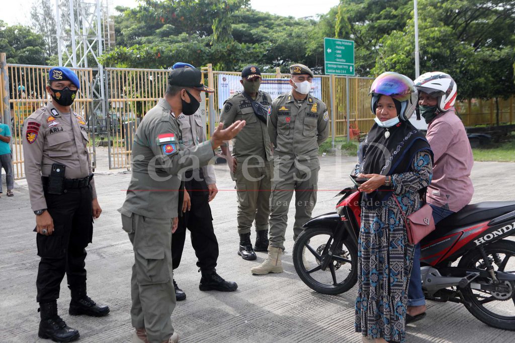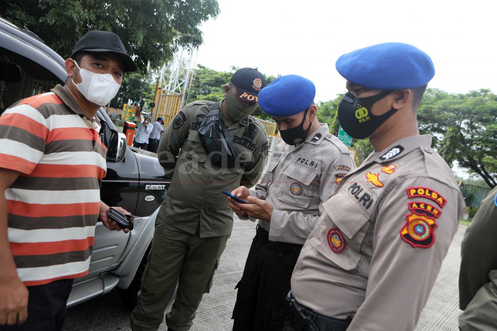 Petugas Gabungan dari Satgas COVID-19 Aceh sedang melakukan pemeriksaan sertifikat vaksin dan hasil swab di Pos Penyekatan Pemberlakukaan Pembatasan Kegiatan Masyarakat (PPKM) Mikro, Pelabuhan Ulee Lheue, Banda Aceh, 13 Juli 2021. Masyarakat yang akan menyeberang ke Sabang melalui Pelabuhan Penyeberangan Ulee Lheue, Banda Aceh wajib memperlihatkan sertifikat vaksin atau Antigen 1×24 jam sebelum membeli tiket pelayaran.