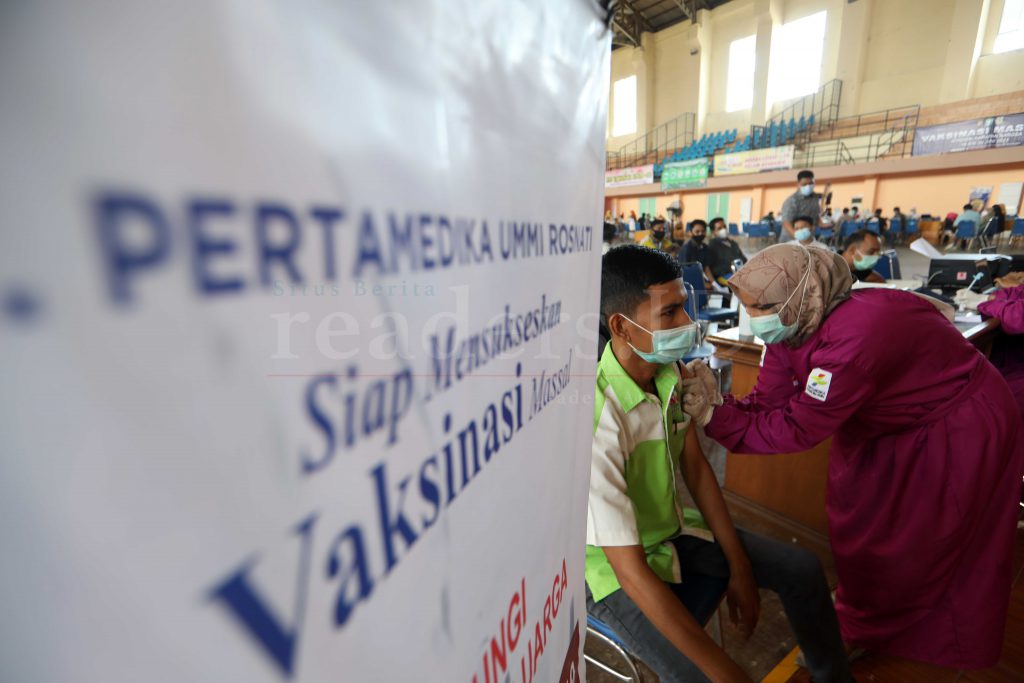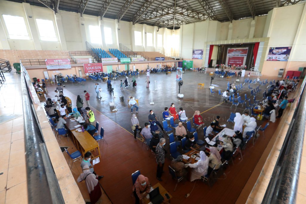 Petugas kesehatan sedang melakukan vaksinasi bagi masyarakat umum saat pelaksanaan vaksinasi massal di stadion Harapan Bangsa, Banda Aceh, Indonesia, 28 Juni 2021. Pemerintah Indonesia mempercepat program vaksinasi masyarakat umum dengan target 1 juta vaksinasi per hari.