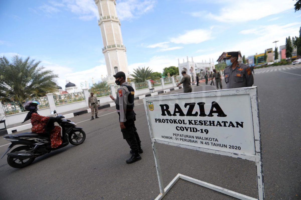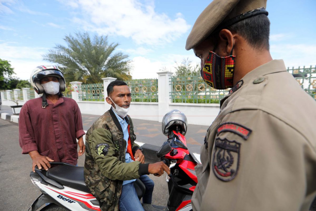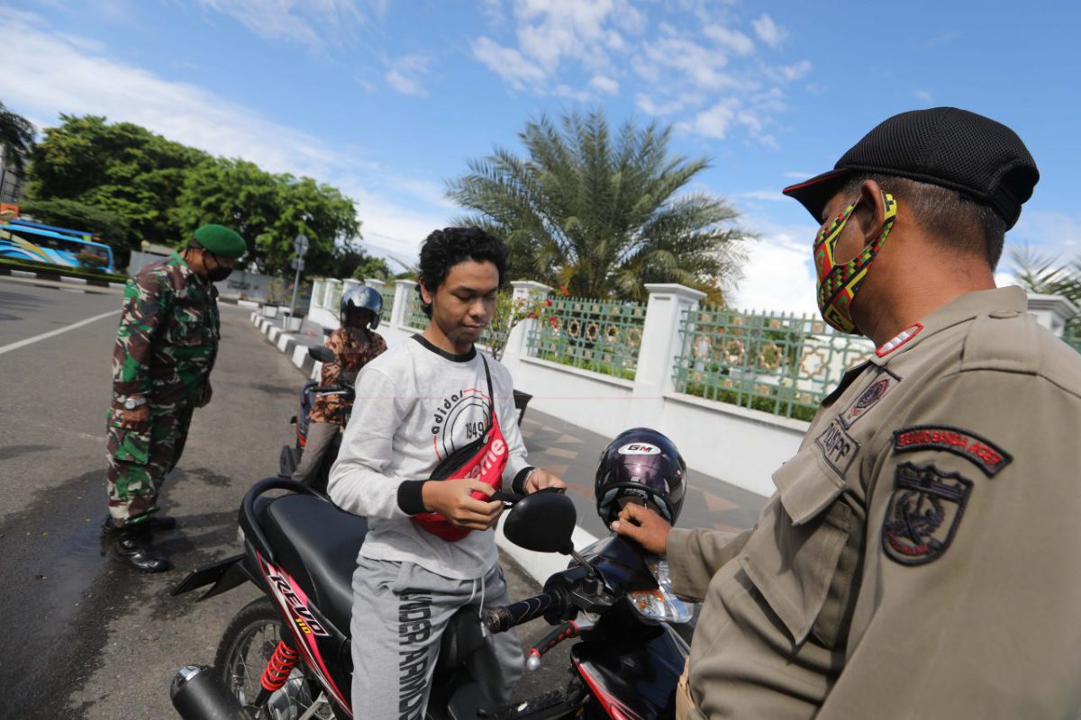 Petugas gabungan sedang melakukan razia masker di depan Mesjid Raya Baiturrahman, Banda Aceh, Indonesia 23 April 2021. Setiap pelanggar yang kedapatan tidak menggunakan masker atau tidak memakai masker sebagai mana mestinya diminta untuk membacakan ayat pendek sebagai bentuk hukuman terhadap pelanggar.