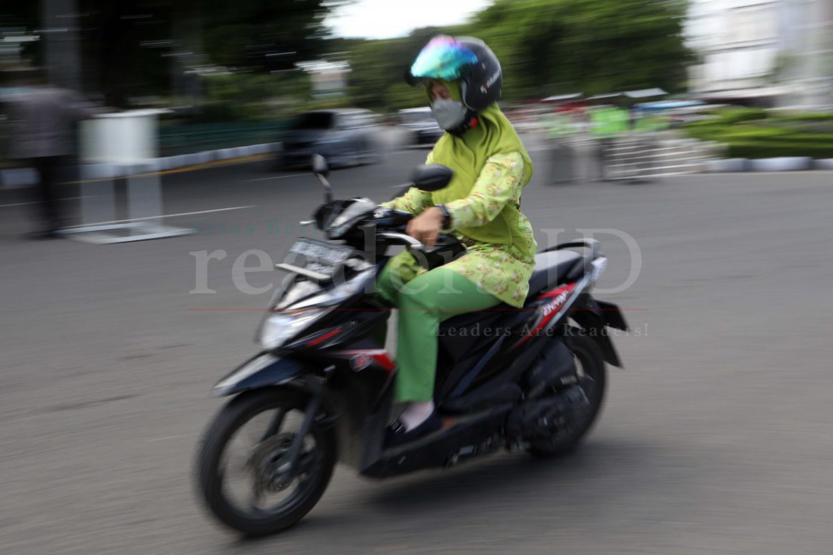 Pengendara motor melintas dengan menggunakan masker saat razia protokol kesehatan. Foto: Hotli Simanjuntak/readers.ID