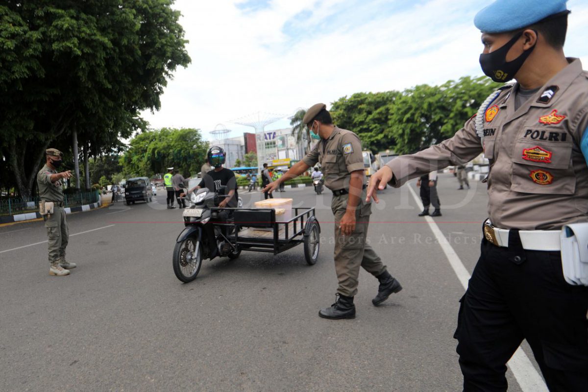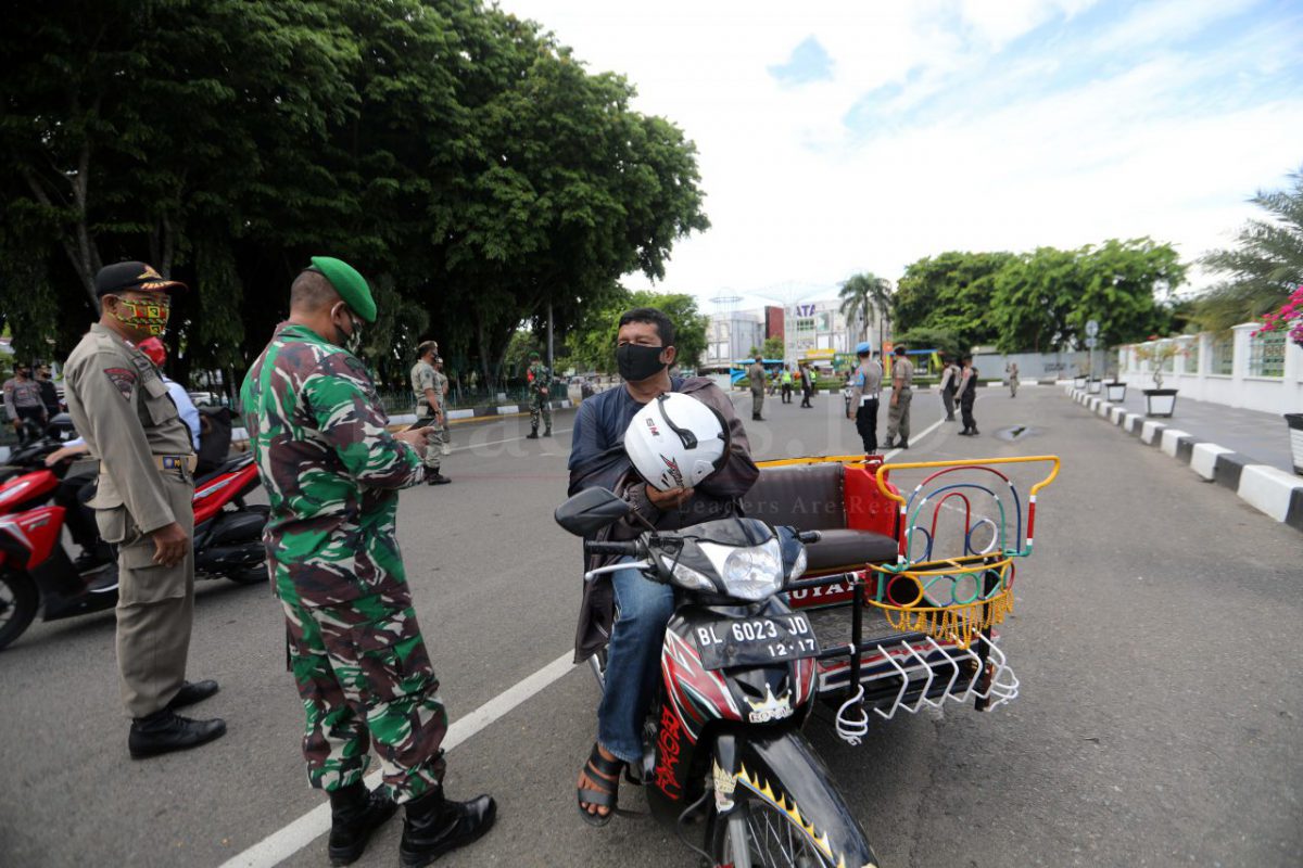 Petugas menghentikan pengguna jalan yang tidak menggunakan masker dan menghukum pelanggar dengan membaca ayat pendek. Foto: Hotli Simanjuntak/readers.ID
