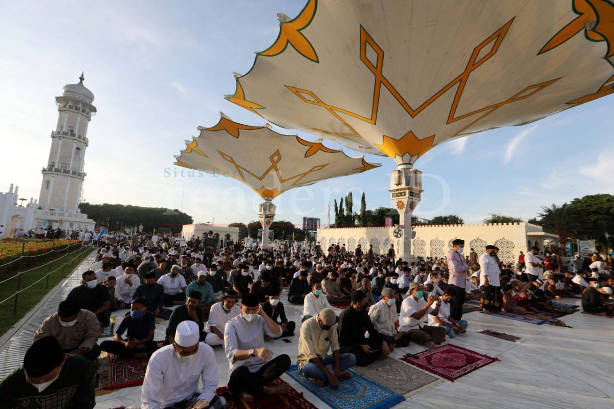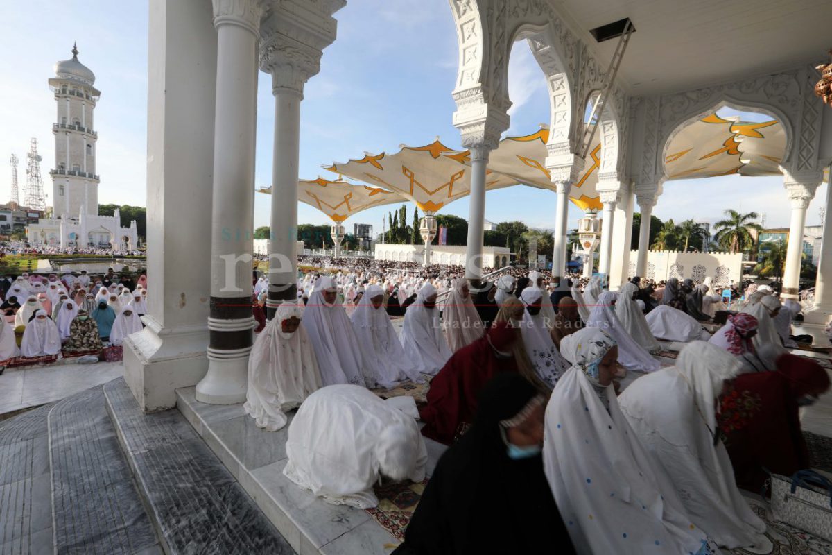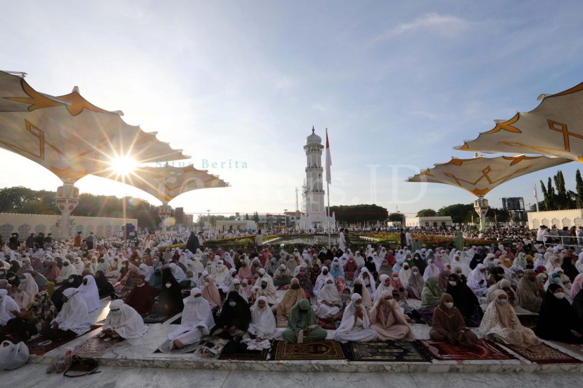 Umat Islam melaksanakan sholad Idul Fitri di Mesjid Raya Baiturrahman, Banda Aceh, 13 Mei 2021. Umat Muslim seluruh dunia merayakan Idul Fitri, hari kemenangan setelah 30 puluh hari lamanya berpuasa menahan hawa nafsu, lapar dan haus.