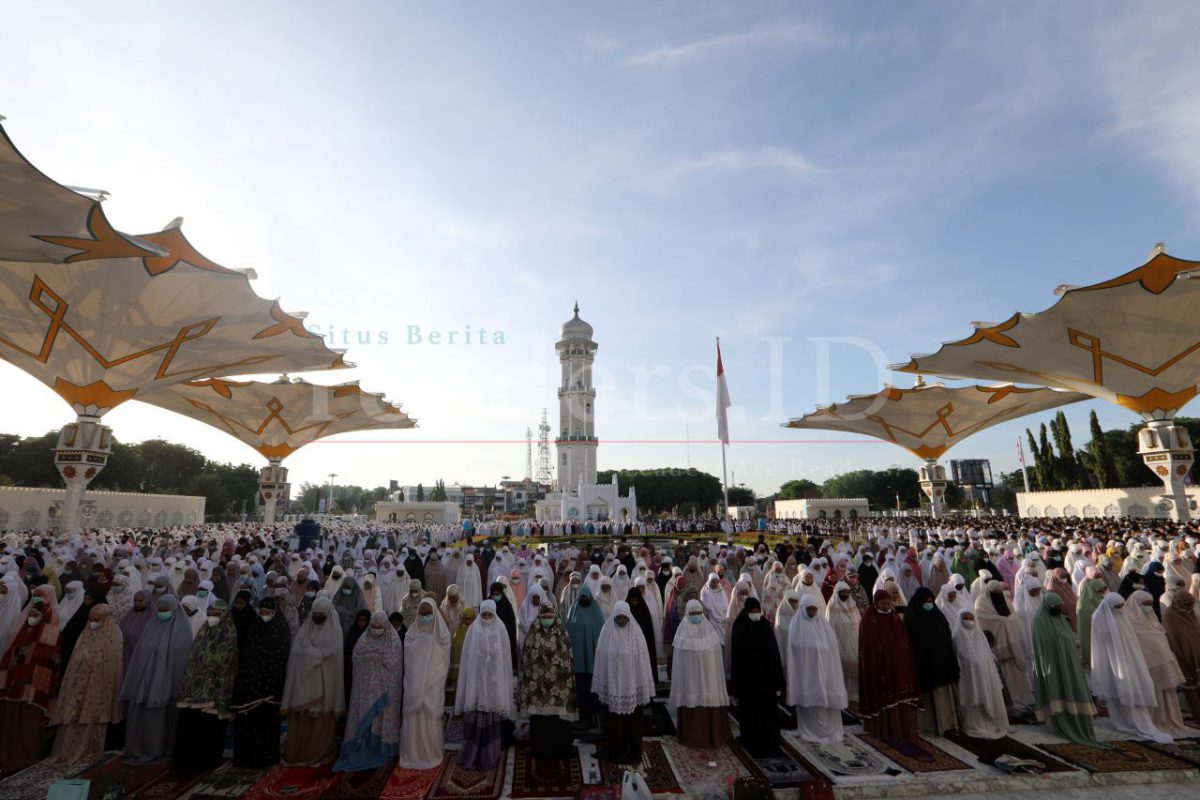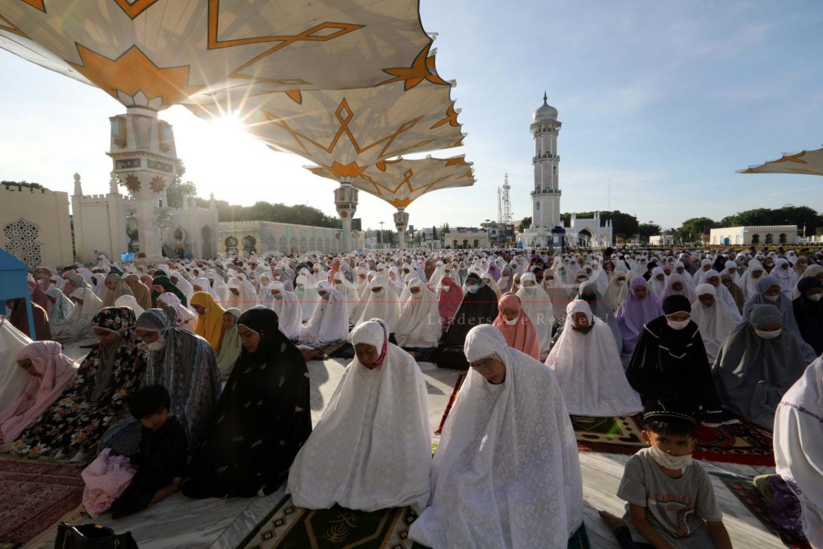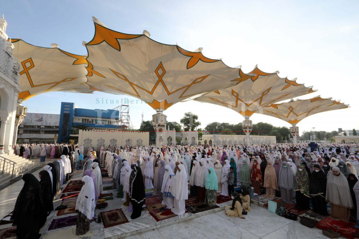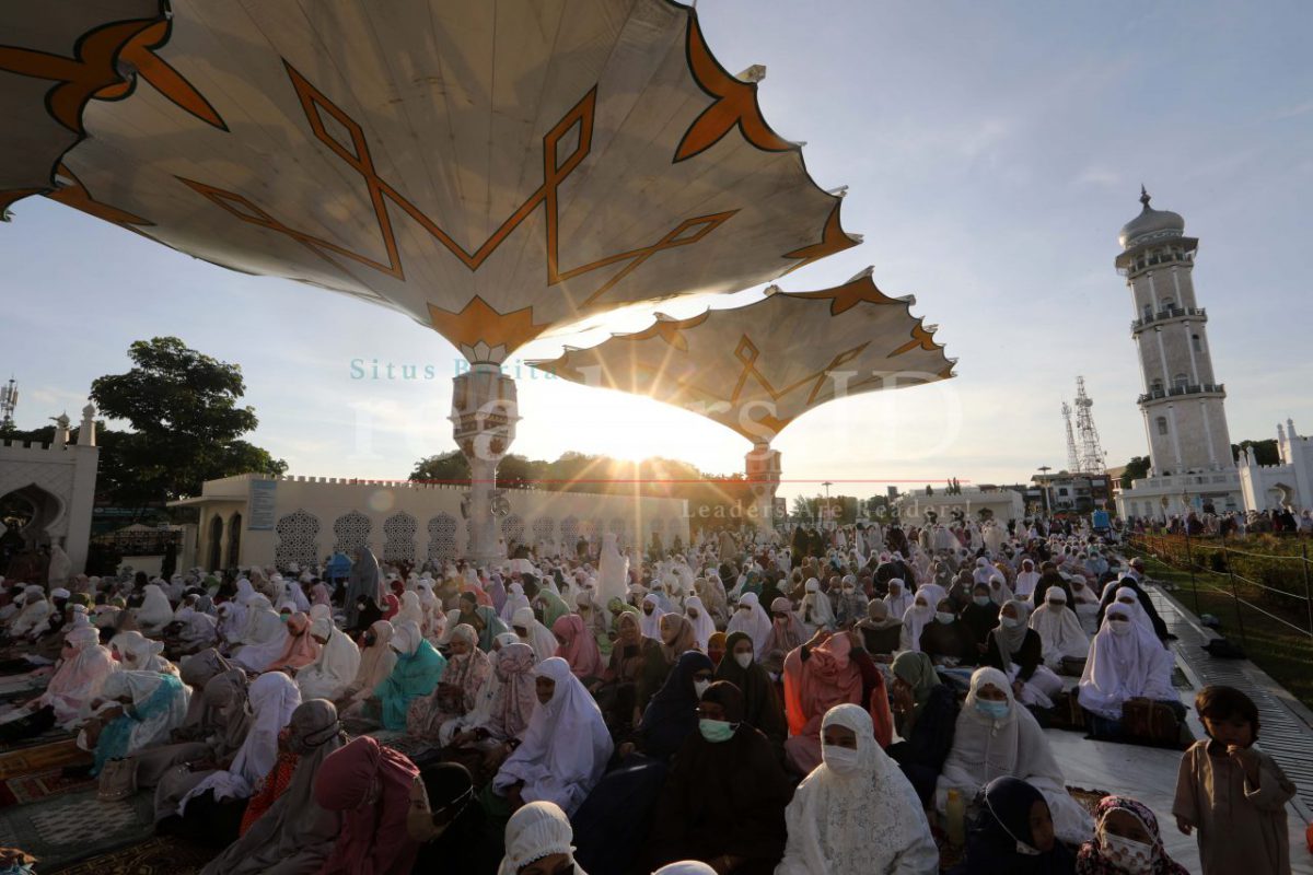 Umat Islam melaksanakan sholad Idul Fitri di Mesjid Raya Baiturrahman, Banda Aceh, 13 Mei 2021. Umat Muslim seluruh dunia merayakan Idul Fitri, hari kemenangan setelah 30 puluh hari lamanya berpuasa menahan hawa nafsu, lapar dan haus.