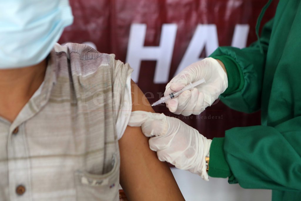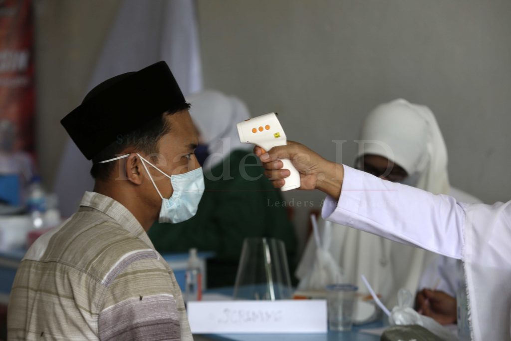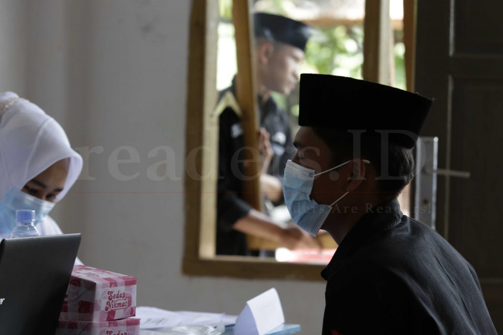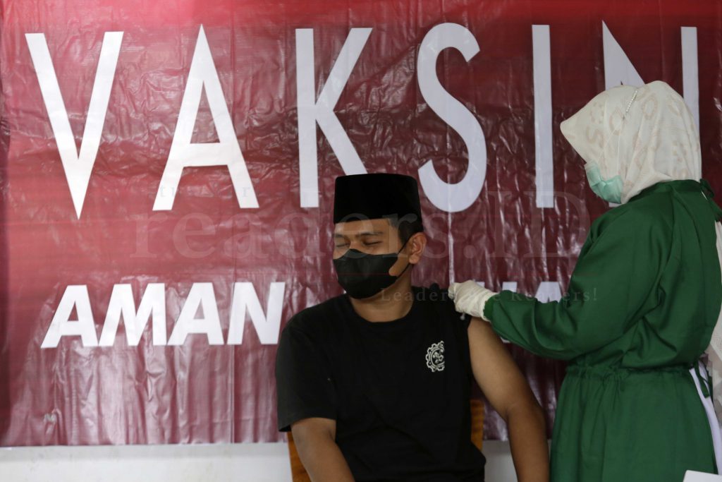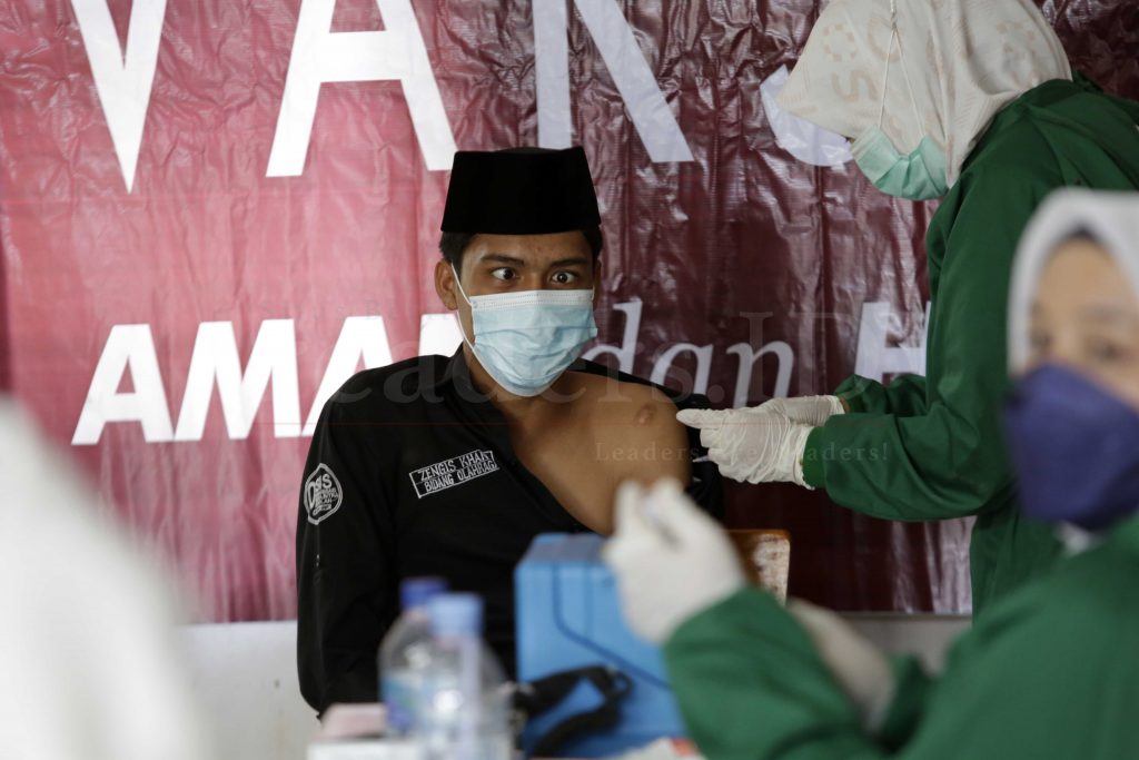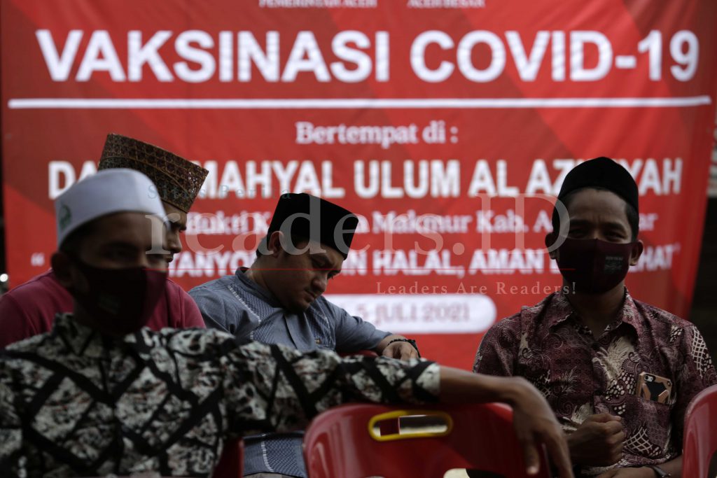Santri Lembaga Pendidikan Islam Dayah Mahyal Al Aziziyah, Kabupaten Aceh Besar sedang menjalani program vaksinasi di pesantren mereka di Sibreh, Aceh Besar, Indonesia, 05 Juli 2021. Pemerintah Indonesia telah menerbitkan surat edaran panduan pelaksanaan vaksinasi COVID-19 bagi kelompok anak usia 12-17 sebanyak dua kali penyuntikan dalam rentang waktu 28 hari dari dosis pertama ke dosis ke dua