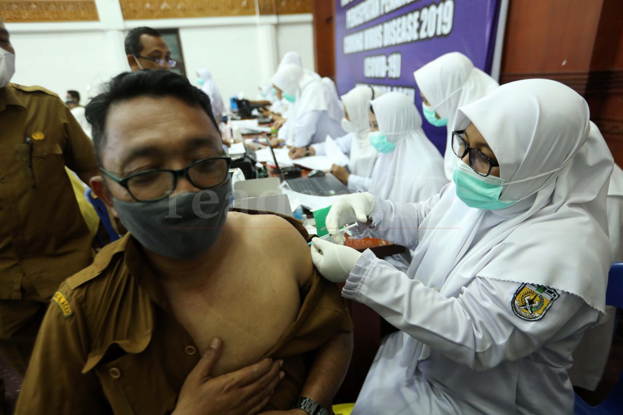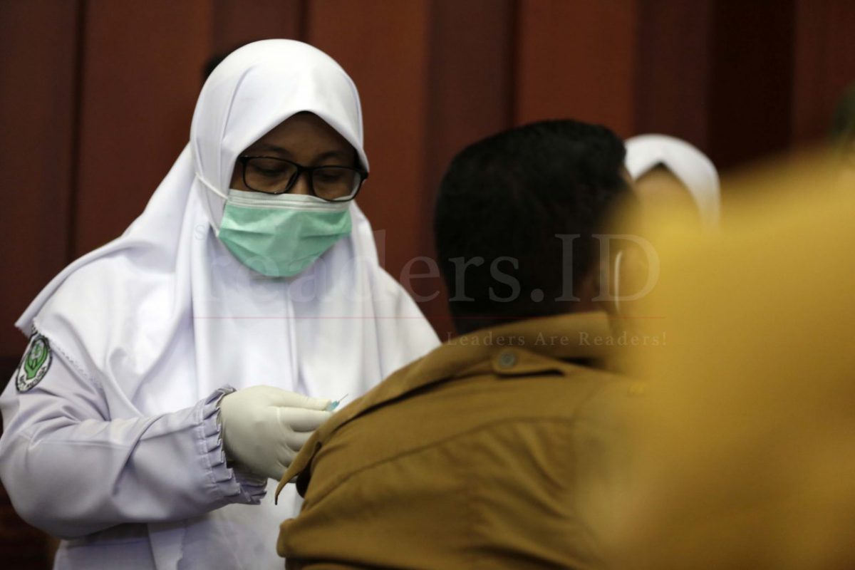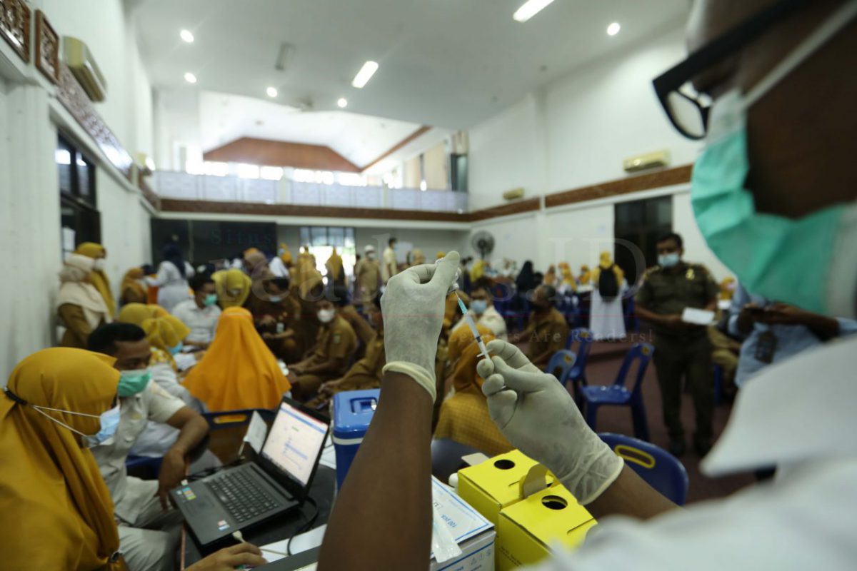 Petugas kesehatan dari Puskesmas sedang melakukan vaksinasi Covid-19 secara massal bagi pegawai Pemerintah sebagai garda terdepan pelayan publik di bekas gedung DPRK Banda Aceh, Indonesia, 05 April 2021. Menurut PT Bio Farma Indonesia, lebih dari 10.428.756 dosis vaksin Covid-19 sudah digunakan yang menempatkan Indonesia sebagai salah satu negara terdepan dan masuk dalam 10 besar negara yang sudah melakukan program vaksinasi COVID-19 secara global.