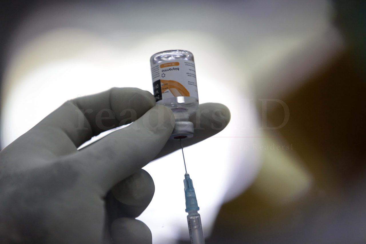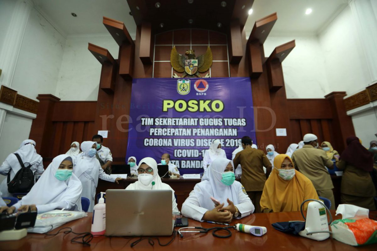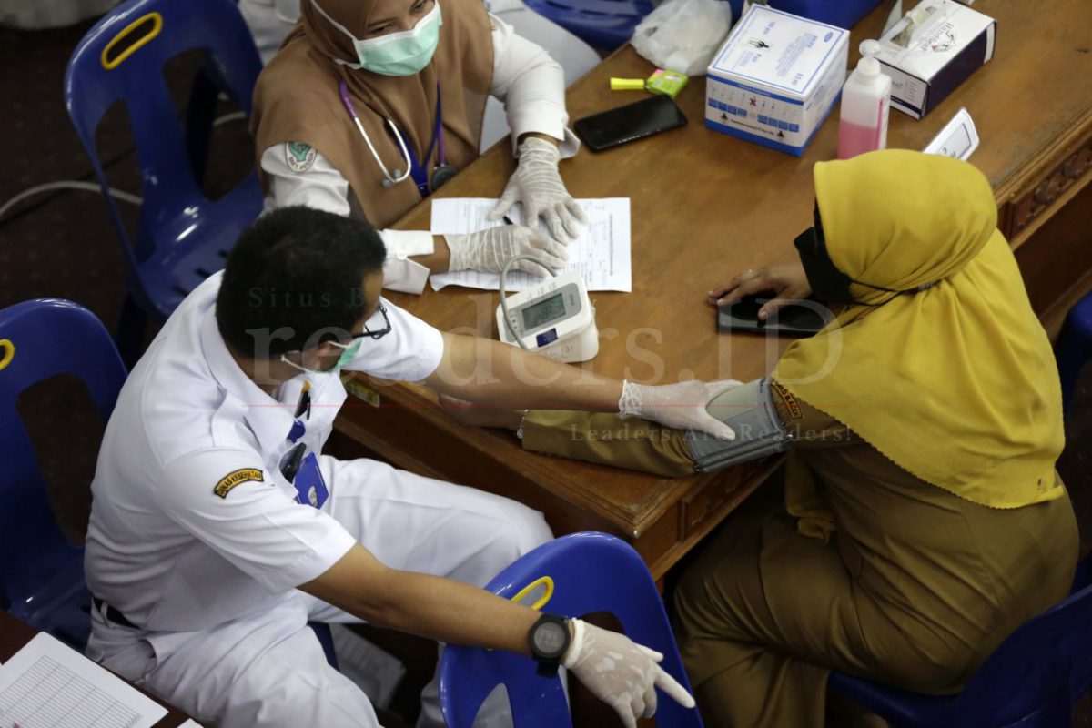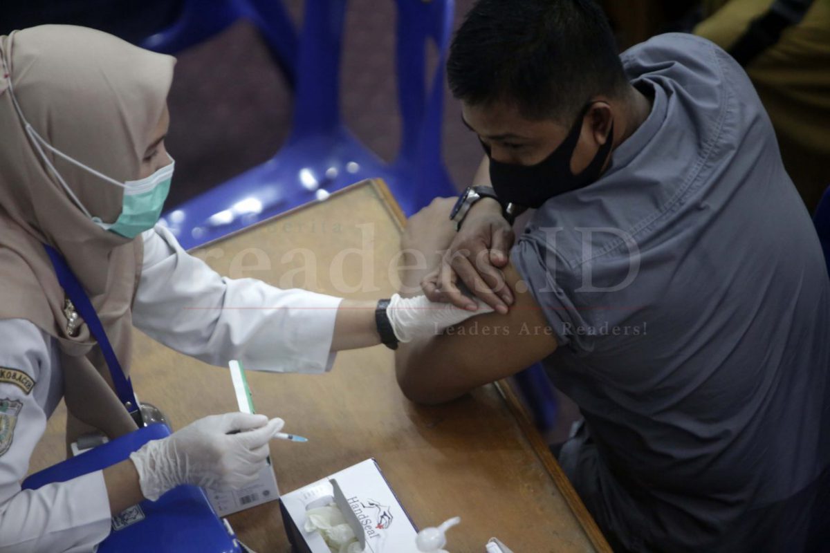 Petugas kesehatan dari Puskesmas sedang melakukan vaksinasi Covid-19 secara massal bagi pegawai Pemerintah sebagai garda terdepan pelayan publik di bekas gedung DPRK Banda Aceh, Indonesia, 05 April 2021. Menurut PT Bio Farma Indonesia, lebih dari 10.428.756 dosis vaksin Covid-19 sudah digunakan yang menempatkan Indonesia sebagai salah satu negara terdepan dan masuk dalam 10 besar negara yang sudah melakukan program vaksinasi COVID-19 secara global.