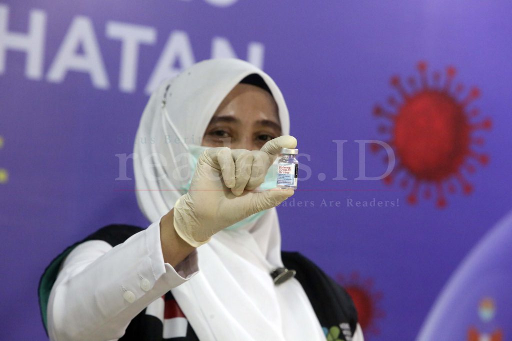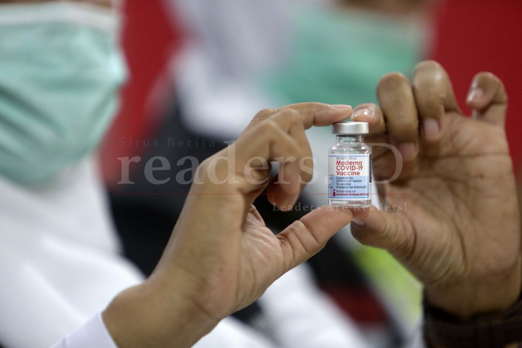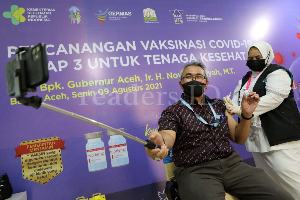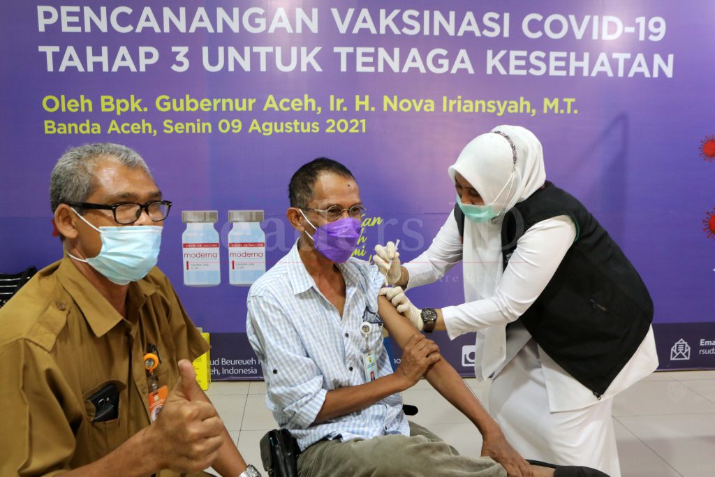Petugas vaksinasi sedang melakukan vaksinasi tahap tiga bagi tenaga kesehatan di Rumah Sakit Umum Zainal Abidin, 09 Agustus 2021. Dinas Kesehatan Provinsi Aceh mulai melakukan vaksinasi tahap ketiga untuk tenaga kesehatan (nakes) dengan menggunakan vaksin merek Moderna .