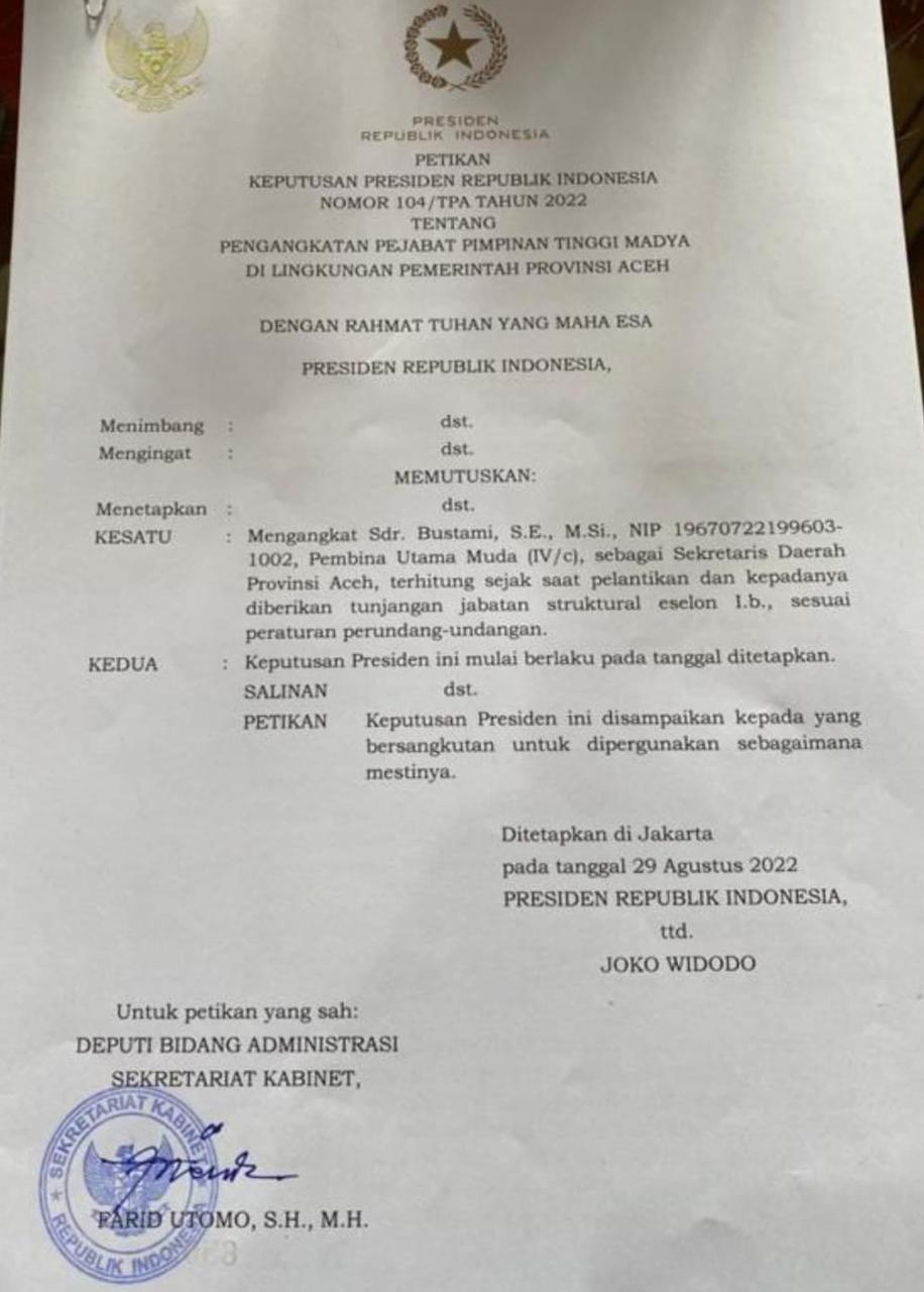 Penunjukan Bustami sebagai Sekda Aceh tertuang dalam Keputusan Presiden (Keppres) Republik Indonesia Nomor 104/TPA Tahun 2022 yang diteken oleh Deputi Bidang Administrasi Sekretariat Kabinet, Farid Utomo, tertanggal 29 Agustus 2022.