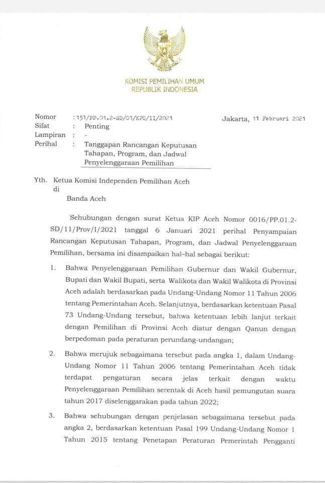 “KIP Aceh dan KIP Kabupaten/Kota, agar tidak menjalankan tahapan pemilihan apa pun sampai ada putusan sesuai dengan Undang–Undang Nomor 6 Tahun 2020,” sebut Plt Ketua KPU, Ilham Saputra dalam surat tanggapan ke KIP Aceh tertanggal 11 Februari 2021.