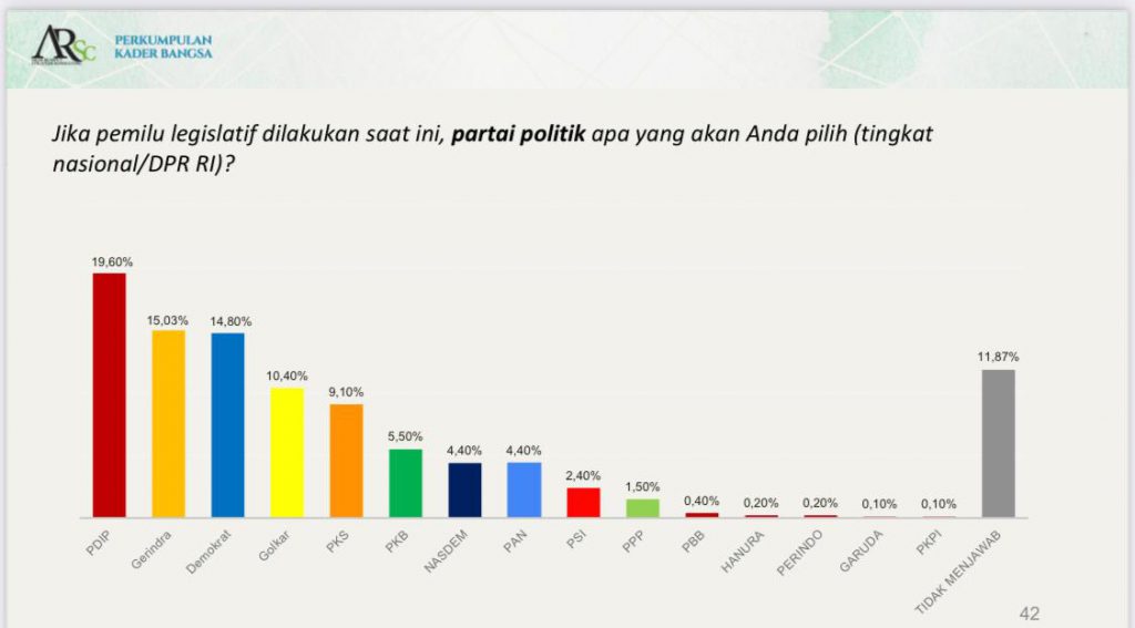 Perkumpulan Kader Bangsa (PKB) bekerjasama dengan Akar Rumput Strategic Consulting (ARSC) merilis survei nasional yang dilakukan akhir April- awal Mei 2021 menempatkan Partai Demokrat masuk dalam tiga besar partai politik dengan elektabilitas tertinggi, dengan proyeksi elektabilitas 14,8 persen, Partai Gerindra 15,03 persen dan PDI-P 19,6 persen.