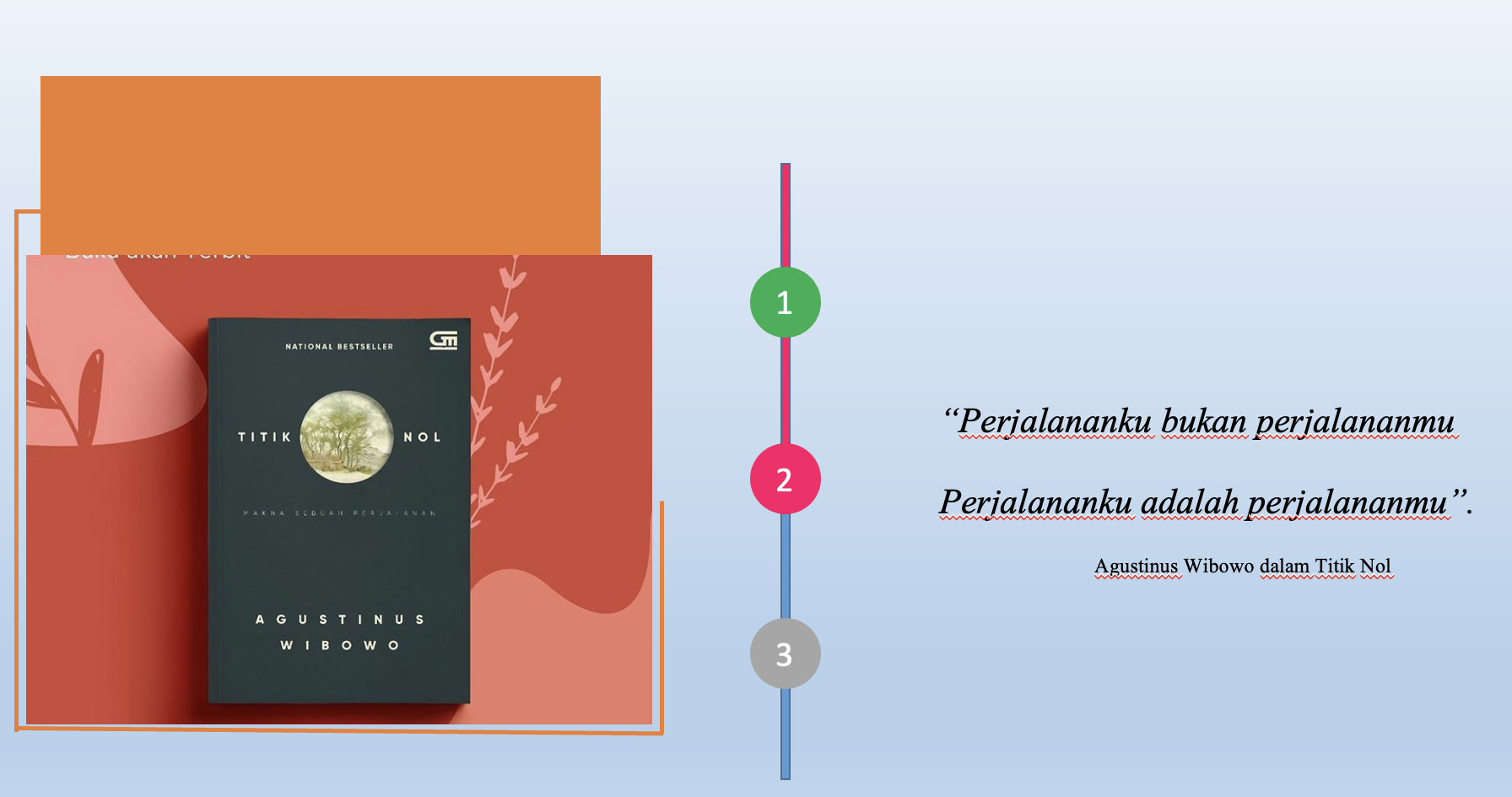 Alih-alih keluar buat nongkrong dengan teman-teman, saya lebih memilih waktu luang dengan membaca buku, dan pilihan saya saat itu tertuju pada buku “TITIK NOL”. Benar, itu adalah sebuah novel berceritakan tentang makna suatu perjalanan yang ditulis oleh Agustinus Wibowo.